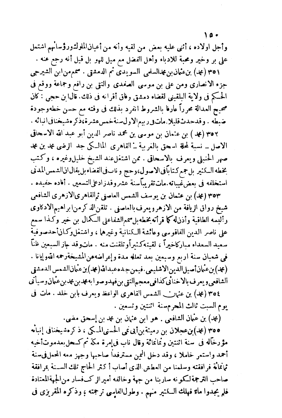 وَأجل أَوْلَاده، أثنى عَلَيْهِ بعض من لقِيه وَأَنه من أَعْيَان الْمُلُوك وَرُؤَسَائِهِمْ اشْتَمَل على بر وَخير ومحبة للأدباء وَأهل الْفضل مَعَ ميل للهو بل قيل أَنه رَجَعَ عَنهُ. مُحَمَّد بن عُثْمَان بن مُحَمَّد السّلمِيّ السويدي ثمَّ الدِّمَشْقِي. سمع من ابْن الشيرجي جُزْء الْأنْصَارِيّ وَمن عَليّ بن مُوسَى الصَّفَدِي والتقي بن رَافع وَجَمَاعَة وَوَقع فِي الحكم فِي ولَايَة البُلْقِينِيّ لقَضَاء دمشق وفَاق أقرانه فِي ذَلِك. قَالَ ابْن حجي: كَانَ صَحِيح الْعَدَالَة محررا عَارِفًا بِالشُّرُوطِ انْفَرد بذلك فِي وقته مَعَ حسن خطه وجودة ضَبطه. وَقد حدث قَلِيلا. مَاتَ فِي ربيع الأول سنة خمس عشرَة، ذكره شَيخنَا فِي إنبائه. مُحَمَّد بن عُثْمَان بن مُوسَى بن مُحَمَّد نَاصِر الدّين أَبُو عبد الله الإسحاقي الأَصْل نِسْبَة لمحلة إِسْحَاق بالغربية القاهري الْمَالِكِي جد الرضي مُحَمَّد بن مُحَمَّد صهر الْحَنْبَلِيّ وَيعرف بالإسحاقي. مِمَّن اشْتغل عِنْد الشَّيْخ خَلِيل وَغَيره، وَكتب بِخَطِّهِ الْكثير بل جمع كتابا فِي الْأُصُول، وَحج وناب فِي الْقَضَاء بل يُقَال إِن الشَّمْس الْمدنِي اسْتَخْلَفَهُ فِي بعض غيباته.