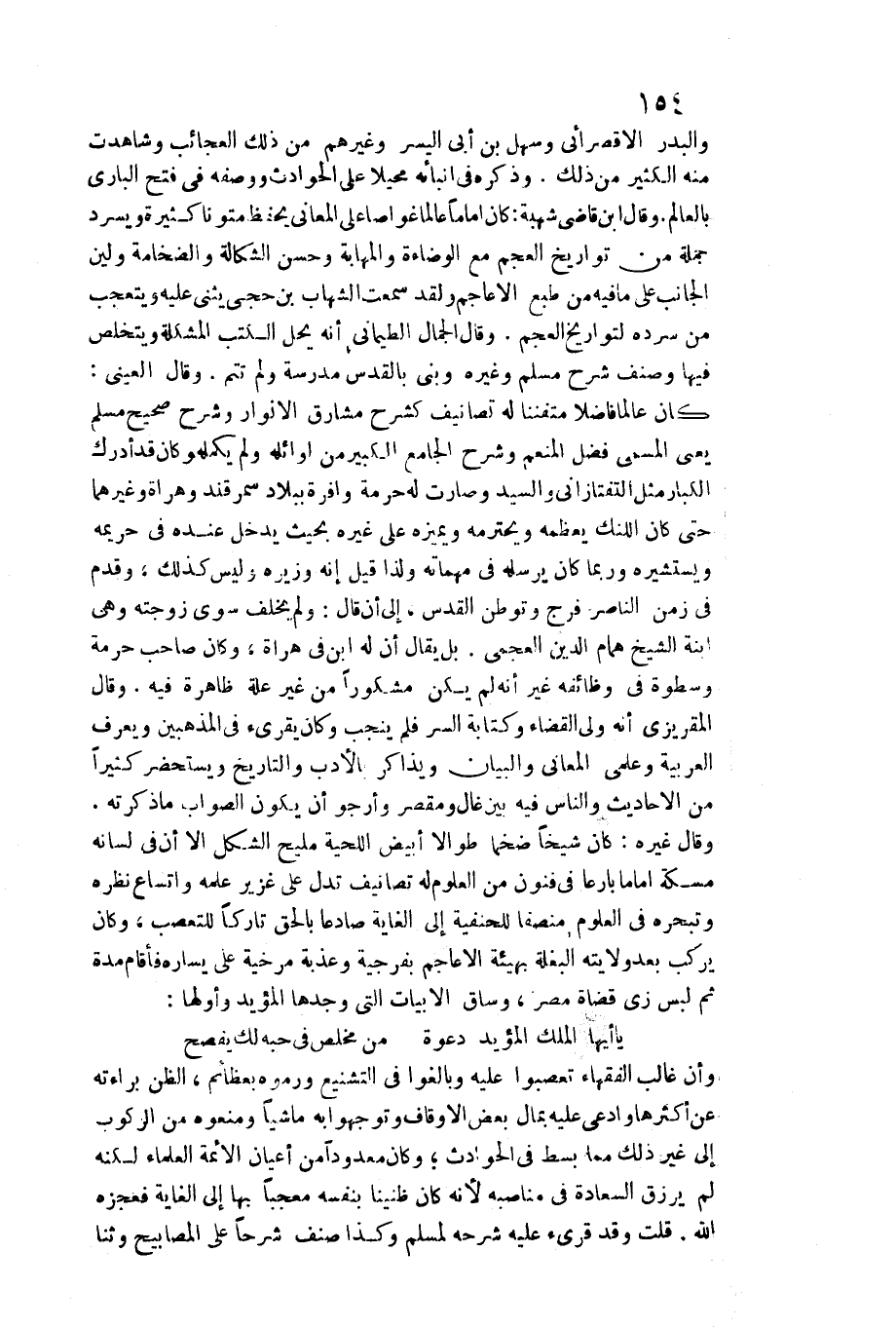 والبدر الأقصرائي وَسَهل بن أبي الْيُسْر وَغَيرهم من ذَلِك الْعَجَائِب وشاهدت مِنْهُ الْكثير من ذَلِك. وَذكره فِي إنبائه محيلا على الْحَوَادِث وَوَصفه فِي فتح الْبَارِي بالعالم. وَقَالَ ابْن قَاضِي شُهْبَة: كَانَ إِمَامًا عَالما غواصا على الْمعَانِي يحفظ متونا كَثِيرَة ويسرد جملَة من تواريخ الْعَجم مَعَ الْوَضَاءَة والمهابة وَحسن الشكالة والضخامة ولين الْجَانِب على مَا فِيهِ من طبع الْأَعَاجِم وَلَقَد سَمِعت الشهَاب بن حجي يثني عَلَيْهِ ويتعجب من سرده لتواريخ الْعَجم. وَقَالَ الْجمال الطيماني أَنه يحل الْكتب المشكلة ويتخلص فِيهَا وصنف شرح مُسلم وَغَيره وَبني بالقدس مدرسة وَلم تتمّ. وَقَالَ الْعَيْنِيّ: كَانَ عَالما فَاضلا متفننا لَهُ تصانيف كشرح مَشَارِق الْأَنْوَار وَشرح صَحِيح مُسلم يعي الْمُسَمّى فضل الْمُنعم وَشرح الْجَامِع الْكَبِير من أَوَائِله وَلم يكمله وَكَانَ قد أدْرك الْكِبَار مثل التَّفْتَازَانِيّ وَالسَّيِّد وَصَارَت لَهُ حُرْمَة وافرة بِبِلَاد سمرقندر وهراة وَغَيرهمَا حَتَّى كَانَ اللنك يعظمه ويحترمه ويميزه على غَيره بِحَيْثُ يدْخل عِنْده فِي حريمه ويستشيره وَرُبمَا كَانَ يُرْسِلهُ فِي مهماته وَلذَا قيل إِنَّه وزيره وَلَيْسَ كَذَلِك، وَقدم فِي زمن النَّاصِر فرج وتوطن الْقُدس، إِلَى أَن قَالَ: وَلم يخلف سوى زَوجته وَهِي وسطوة فِي وظائفه غير أَنه لم يكن مشكورا من غير)