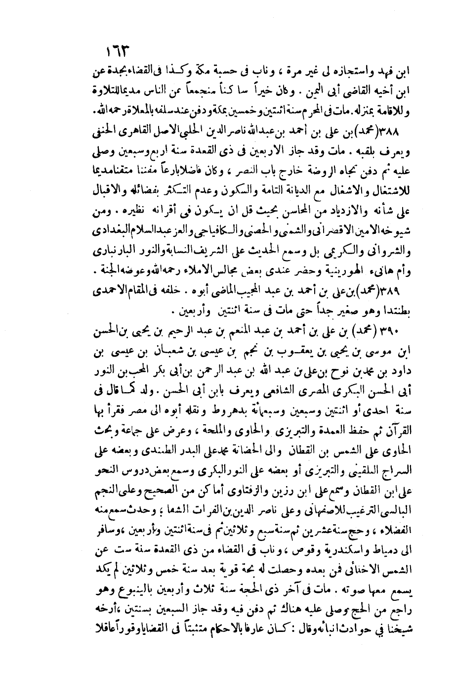 ابْن فَهد واستجازه لي غير مرّة، وناب فِي حسبَة مَكَّة وَكَذَا فِي الْقَضَاء بجدة عَن ابْن أَخِيه القَاضِي أبي الْيمن. وَكَانَ خيرا سَاكِنا منجمعا عَن النَّاس مديما للتلاوة وللإقامة بمنزله. مَاتَ فِي الْمحرم سنة اثْنَتَيْنِ وَخمسين بِمَكَّة وَدفن عِنْد سلفه بالمعلاة رَحمَه الله. مُحَمَّد بن عَليّ بن أَحْمد بن عبد الله نَاصِر الدّين الْحلَبِي الأَصْل القاهري الْحَنَفِيّ وَيعرف بلقبه. مَاتَ وَقد جَازَ الْأَرْبَعين فِي ذِي الْقعدَة سنة أَربع وَسبعين وَصلي عَلَيْهِ ثمَّ دفن تجاه الرَّوْضَة خَارج بَاب النَّصْر، وَكَانَ فَاضلا بارعا مفنناص متقنا ميدما للاشتغال والأشغال مَعَ الدّيانَة التَّامَّة والسكون وَعدم التكثر بفضائله والإقبال على شَأْنه والازدياد من المحاسن بِحَيْثُ قل أَن يكون فِي أقرانه نظريه. وَمن شُيُوخه الْأمين الأقصرائي والشمني والحصني والكافياجي والعز عبد السَّلَام الْبَغْدَادِيّ والشرواني والكريمي بل وَسمع الحَدِيث على الشريف النسابة والنور البارنباري وَأم هَانِئ الهورينية وَحضر عِنْدِي بعض مجَالِس الْإِمْلَاء رَحمَه الله وعوضه الْجنَّة. مُحَمَّد بن عَليّ بن أَحْمد بن عبد الْمُجيب الْمَاضِي أَبوهُ. خَلفه فِي الْمقَام الأحمدي بطنتدا وَهُوَ صَغِير جدا حَتَّى مَاتَ فِي سنة اثْنَتَيْنِ وَأَرْبَعين. مُحَمَّد بن عَليّ بن أَحْمد بن عبد الْمُنعم بن عبد الرَّحِيم بن يحيى بن الْحسن بن مُوسَى بن يحيى بن يَعْقُوب بن نجم بن عِيسَى بن شعْبَان بن عِيسَى بن دَاوُد بن مُحَمَّد بن نوح بن عَليّ بن عبد الله بن عبد الرَّحْمَن بن أبي بكر الْمُحب بن النُّور ابي الْحسن الْبكْرِيّ الْمصْرِيّ الشَّافِعِي وَيعرف بِابْن أبي الْحسن. ولد كَمَا قَالَ فِي سنة إِحْدَى أَو اثْنَتَيْنِ وَسبعين وَسَبْعمائة بدهروط وَنَقله أَبوهُ إِلَى مصر فَقَرَأَ بهَا الْقُرْآن ثمَّ حفظ الْعُمْدَة والتبريزي وَالْحَاوِي والملحة، وَعرض على جمَاعَة وَبحث الْحَاوِي على الشَّمْس بن الْقطَّان وَالِي الْحَضَانَة مُحَمَّد على الْبَدْر الطندي وَبَعضه على السراج البُلْقِينِيّ والتريزي أَو بعضه على النُّور الْبكْرِيّ وَسمع بعض دروس النَّحْو على ابْن الْقطَّان وَسمع على ابْن رزين والزفتاوي أَمَاكِن من الصَّحِيح وعَلى النَّجْم البالسي التَّرْغِيب للأصفهاني وعَلى نَاصِر الدّين بن الْفُرَات الشفا وَحدث سمع)