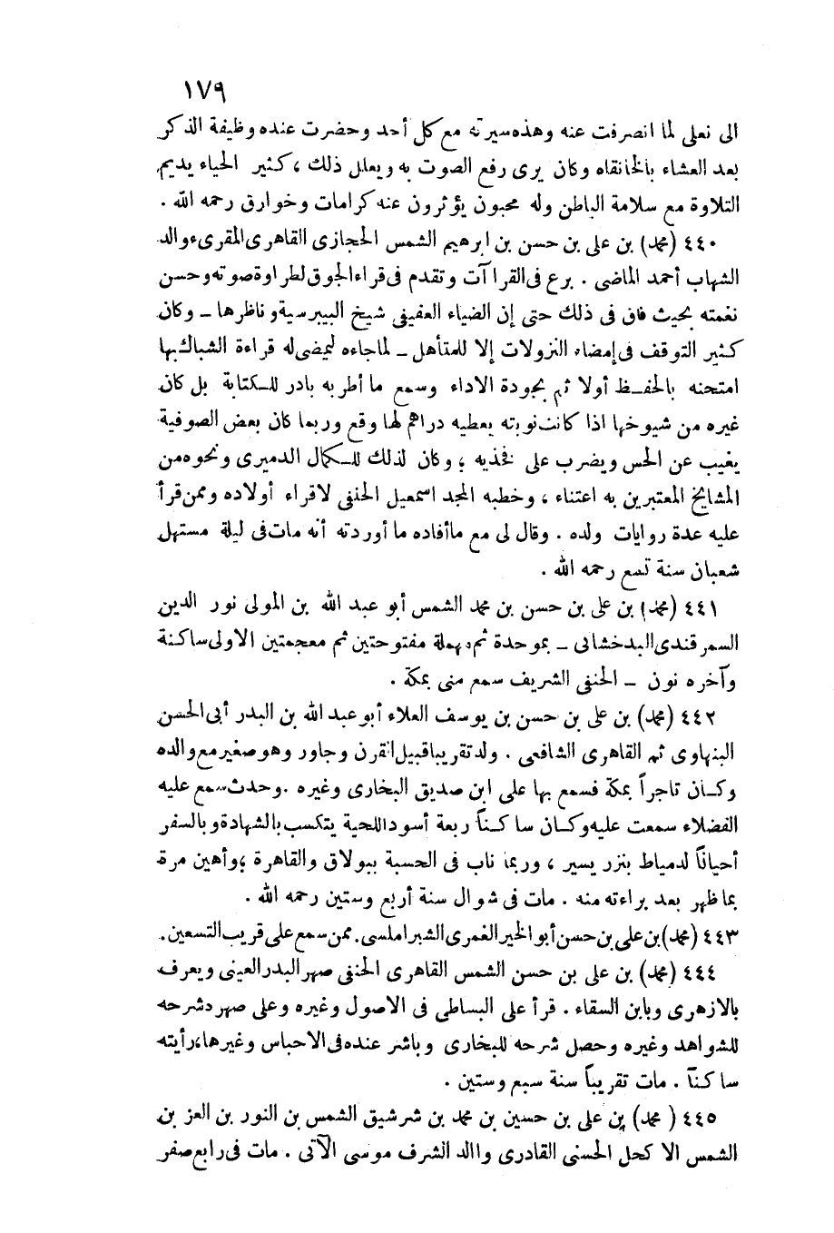 إِلَى نَعْلي لما انصرفت عَنهُ وَهَذِه سيرته مَعَ كل أحد وَحَضَرت عِنْده وَظِيفَة الذّكر بعد الْعشَاء بالخانقاه وَكَانَ يرى رفع الصَّوْت بِهِ ويعلل ذَلِك، كثير الْحيَاء يديم التِّلَاوَة مَعَ سَلامَة الْبَاطِن وَله محبون يؤثرون عَنهُ كرامات وخوارق رَحمَه الله. مُحَمَّد بن عَليّ بن حسن بن إِبْرَاهِيم الشَّمْس الْحِجَازِي القاهري الْمُقْرِئ وَالِد الشهَاب أَحْمد الْمَاضِي. برع فِي القراآت وَتقدم فِي قراء الجوق لطراوة صَوته وَحسن نغمته بِحَيْثُ فاق فِي ذَلِك حَتَّى إِن الضياء العفيفي شيخ البيبرسية وناظرها وَكَانَ كثير التَّوَقُّف فِي إِمْضَاء النزولات إِلَّا للمتأهل لما جَاءَهُ ليمضي لَهُ قِرَاءَة الشباك بهَا امتحنه بِالْحِفْظِ أَولا ثمَّ بجودة الْأَدَاء وَسمع مَا أطربه بَادر للكتابة بل كَانَ غَيره من شيوخها إِذا كَانَت نوبَته بعطية دَرَاهِم لَهَا وَقع وَرُبمَا كَانَ بعض الصُّوفِيَّة يغيب عَن الْحس وَيضْرب على فَخذيهِ وَكَانَ لذَلِك للكمال الدَّمِيرِيّ وَنَحْوه من الْمَشَايِخ المعتبرين بِهِ اعتناء، وخطبه الْمجد إِسْمَاعِيل الْحَنَفِيّ لإقراء أَوْلَاده وَمِمَّنْ قَرَأَ عَلَيْهِ عد رِوَايَات وَلَده. وَقَالَ لي مَعَ مَا أَفَادَهُ مَا أوردته أَنه مَاتَ فِي لَيْلَة مستهل شعْبَان سنة تسع رَحمَه الله. مُحَمَّد بن عَليّ بن حسن بن مُحَمَّد الشَّمْس أَبُو عبد الله بن الْمولى نور الدّين السَّمرقَنْدِي البدخشاني بموحدة ثمَّ مُهْملَة مفتوحتين ثمَّ معجمتين الأولى سَاكِنة وَآخره نون الْحَنَفِيّ الشريف سمع مني بِمَكَّة. مُحَمَّد بن عَليّ بن حسن بن يُوسُف الْعَلَاء أَبُو عبد الله بن الْبَدْر أبي الْحسن البنهاوي ثمَّ القاهري الشَّافِعِي. ولد تقريا قبيل الْقرن وجاور وَهُوَ صَغِير مَعَ وَالِده وَكَانَ تَاجِرًا بِمَكَّة فَسمع بهَا على ابْن صديق البُخَارِيّ وَغَيره. وَحدث سمع عَلَيْهِ الْفُضَلَاء سَمِعت عَلَيْهِ وَكَانَ سَاكِنا ربعَة أسود اللِّحْيَة يتكسب بِالشَّهَادَةِ وبالسفر أَحْيَانًا لدمياط بنزر يسير، وَرُبمَا نَاب فِي)