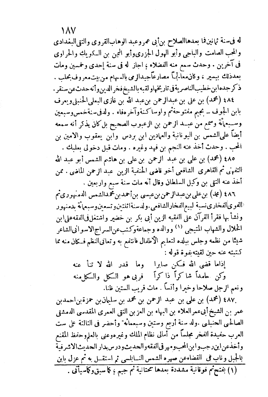 لَهُ فِي سنة ثَمَانِينَ فَمَا بعْدهَا الصّلاح بن أبي عمر وَعبد الْوَهَّاب الْقَرَوِي والتقى الْبَغْدَادِيّ والمحب الصَّامِت والباجي وَأَبُو الهول الْجَزرِي وَأَبُو الْيمن بن الكويك والحراوي فِي آخَرين. وَحدث سمع مِنْهُ الْفُضَلَاء أجَاز لَهُ فِي سنة إِحْدَى وَخمسين وَمَات بعد ذَلِك بِيَسِير، وَكَانَ معالجا مصارعا جيد الرَّمْي بِالسِّهَامِ من بَيت مَعْرُوف بحلب ذكر جده ابْن خطيب الناصرية فِي تاريخها ولقبه بالشيخ فَخر الدّين وَأَنه حدث عَن سنقر. مُحَمَّد بن عَليّ بن عبد الرَّحْمَن بن عبد الله بن غَازِي البعلي الْحَنْبَلِيّ وَيعرف بِابْن الْجوف بجيم مَفْتُوحَة ثمَّ وَاو سَاكِنة وَآخره فَاء. ولد فِي سنة خمس وَسبعين وَسَبْعمائة وَسمع من عبد الرَّحْمَن بن الزعبوب الصَّحِيح بل كَانَ يذكر أَنه سَمعه ايضا على الشَّمْس بن اليونانية والعمادين ابْن بردس وَابْن يَعْقُوب والأمين بن الْمُحب. وَحدث أَخذ عَنهُ النَّجْم بن فَهد وَغَيره. وَمَات قبل دخولي بعلبك. مُحَمَّد بن عَليّ بن عبد الرَّحْمَن بن عَليّ بن هَاشم الشَّمْس أَبُو عبد الله التفهني ثمَّ القاهري الشَّافِعِي أَخُو قَاضِي الْحَنَفِيَّة الزين عبد الرَّحْمَن الْمَاضِي. مِمَّن أَخذ عَنهُ التقي بن وَكيل السُّلْطَان وَقَالَ أَنه مَاتَ سنة سبع وَأَرْبَعين. مُحَمَّد بن عَليّ بن عبد الرَّحْمَن بن عِيسَى بن أَحْمد بن مُحَمَّد الشَّمْس الدمنهوري ثمَّ الفوى الفخاري نِسْبَة لبيع الفخار الشَّافِعِي. ولد سنة اثْنَتَيْنِ وَتِسْعين وَسَبْعمائة بدمنهور وَنَشَأ بهَا فَقَرَأَ الْقُرْآن على الْفَقِيه الزين أبي بكر بن خضير واشتغل فِي الْفِقْه على ابْن الْخلال والشهاب المتيجي ووالده وَجَمَاعَة وَكتب عَن السراج الأسواني الشَّاعِر شَيْئا من نظمه وَجلسَ بِبَلَدِهِ لتعليم الْأَطْفَال فَانْتَفع بِهِ وتعانى النّظم فَكَانَ مِنْهُ مِمَّا كتبته عَنهُ حِين لَقيته بفوة قَوْله:)
