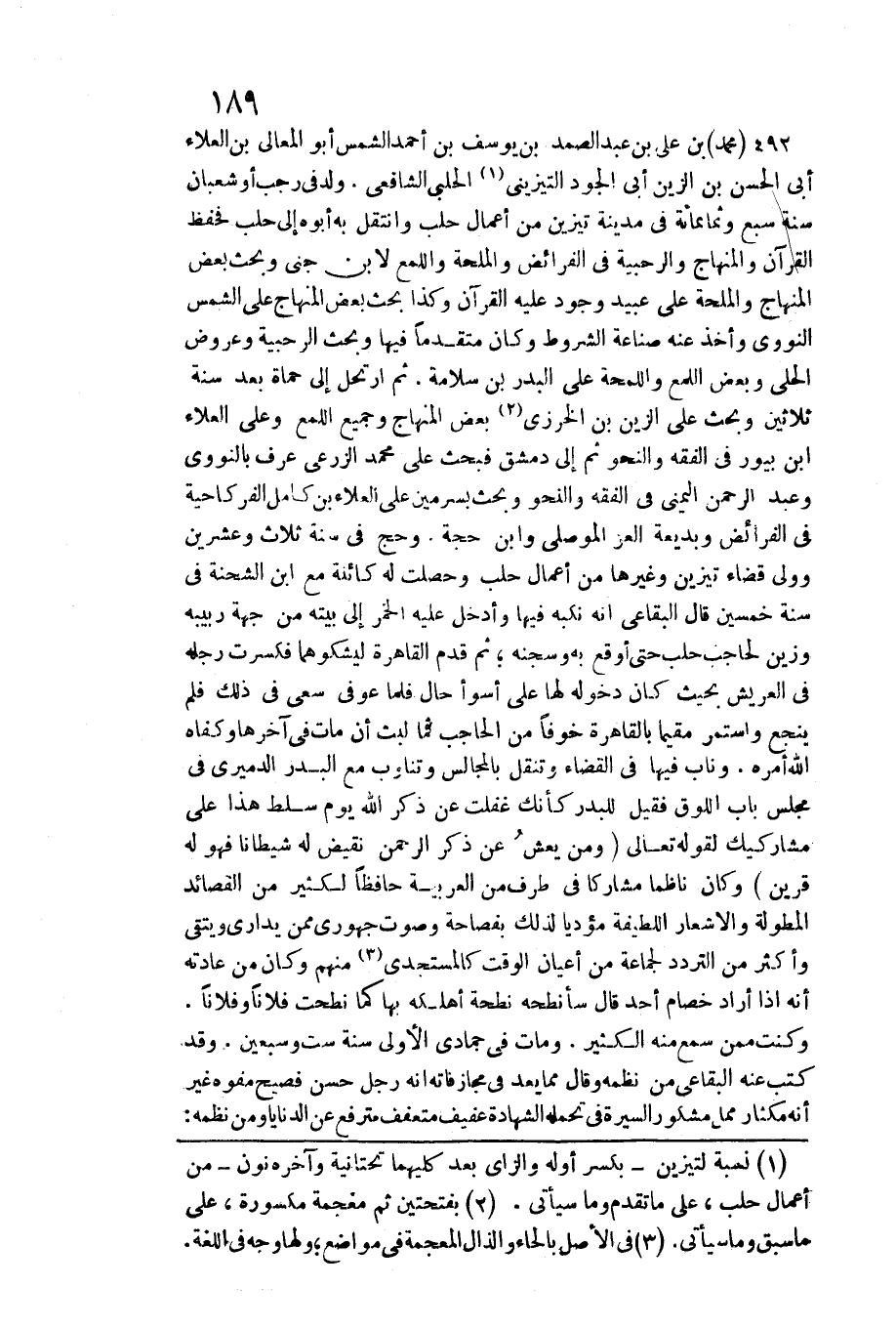 مُحَمَّد بن عَليّ بن عبد الصَّمد بن يُوسُف بن أَحْمد الشَّمْس أَبُو الْمَعَالِي بن الْعَلَاء أبي الْحسن بن الزين أبي الْجُود التيزيني الْحلَبِي الشَّافِعِي. ولد فِي رَجَب أَو شعْبَان سنة سبع وَثَمَانمِائَة فِي مَدِينَة تيزين من أَعمال حلب وانتقل بِهِ أَبوهُ إِلَى حلب فحفظ الْقُرْآن والمنهاج والرحبية فِي الْفَرَائِض والملحة واللمع لِابْنِ جني وَبحث بعض الْمِنْهَاج والملحة على عبيد وجود عَلَيْهِ الْقُرْآن وَكَذَا بحث بعض الْمِنْهَاج على الشَّمْس النَّوَوِيّ وَأخذ عَنهُ صناعَة الشُّرُوط وَكَانَ مُتَقَدما فِيهَا وَبحث الرحبية وعروض الْحلِيّ وَبَعض اللمع واللمحة على الْبَدْر بن سَلامَة. ثمَّ ارتحل إِلَى حماة بعد سنة ثَلَاثِينَ وَبحث على الزين بن الخرزي بعض الْمِنْهَاج وَجَمِيع اللمع على الْعَلَاء بن بيور فِي الْفِقْه والنحو ثمَّ إِلَى دمشق فبحث على مُحَمَّد الزرعي عرف بالنووي وَبعد الرَّحْمَن اليمني فِي الْفِقْه والنحو وَبحث بسرمين على الْعَلَاء بن كَامِل الرفكاحية فِي الْفَرَائِض وبديعة الْعِزّ الْموصِلِي وَابْن حجَّة. وَحج فِي سنة ثَلَاث وَعشْرين وَولي قَضَاء تيزين وَغَيرهَا من أَعمال حلب وحصلت لَهُ كائنة مَعَ ابْن الشّحْنَة فِي سنة خمسين قَالَ البقاعي أَنه نكبه فِيهَا وَأدْخل عَلَيْهِ الْخمر إِلَى بَيته من جِهَة ربيبه وزين لحاجب حلب حَتَّى أوقع بِهِ وسجنه ثمَّ قدم الْقَاهِرَة ليشكوهما فَكسرت رجله فِي الْعَريش بِحَيْثُ كَانَ دُخُوله لَهَا على أَسْوَأ حَال فَلَمَّا عوفي سعى فِي ذَلِك فَلم ينجع وَاسْتمرّ مُقيما بِالْقَاهِرَةِ خوفًا)