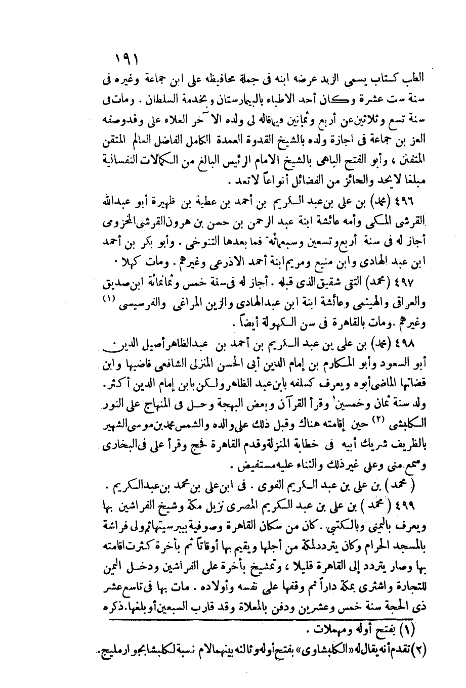 الطِّبّ كتاب يُسمى الزّبد عرضه ابْنه فِي جملَة محافيظه على ابْن جمَاعَة وَغَيره فِي سنة سِتّ عشرَة وَكَانَ أحد الْأَطِبَّاء بالبيمارستان وبخدمة السُّلْطَان. وَمَات فِي سنة تسع وَثَلَاثِينَ عَن أَربع وَثَمَانِينَ فِيمَا قَالَه لي وَلَده الآخر الْعَلَاء عَليّ وَقد وَصفه الْعِزّ بن جمَاعَة فِي إجَازَة وَلَده بالشيخ الْقدْوَة الْعُمْدَة الْكَامِل الْفَاضِل السَّالِم المتقن المتفنن، وَأَبُو الْفَتْح الباهي بالشيخ الإِمَام الرئيس الْبَالِغ من الكمالات النفسانية مبلغا لَا يحد والحائز من الْفَضَائِل أنواعا لَا تعد. مُحَمَّد بن عَليّ بن عبد الكيم بن أَحْمد بن عَطِيَّة بن ظهيرة أَبُو عبد الله الْقرشِي الْمَكِّيّ وَأمه عَائِشَة ابْنة عبد الرَّحْمَن بن حسن بن هَارُون الْقرشِي المَخْزُومِي أجَاز لَهُ فِي سنة أَربع وَتِسْعين وَسَبْعمائة فَمَا بعْدهَا التنوخي. وَأَبُو بكر بن أَحْمد بن عبد الْهَادِي وَابْن منيع وَمَرْيَم ابْنة أَحْمد الْأَذْرَعِيّ وَغَيرهم. وَمَات كهلا. مُحَمَّد التقي شَقِيق الَّذِي قبله. أجَاز لَهُ فِي سنة خمس وَثَمَانمِائَة ابْن صديق والعراقي والهيثمي وَعَائِشَة ابْنة ابْن عبد الْهَادِي والزين المراغي والفرسيسي وَغَيرهم. وَمَات بِالْقَاهِرَةِ فِي سنّ الكهولة أَيْضا.)