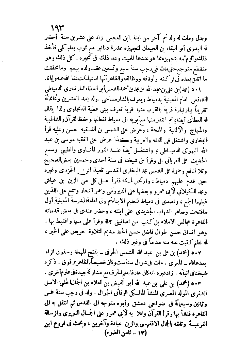عرض على الْفَقِيه مُوسَى بن عبد الله البهوتي الدمياطي واشتغل أَيْضا عِنْد النُّور الْمَنَاوِيّ وَالطِّيبِي وَسمع الحَدِيث على الْفِرْيَانِيُّ بل وَقَرَأَ على شَيخا فِي سنة إِحْدَى وَخمسين بعض الصَّحِيح وتلا لنافع وَحَمْزَة على الشَّمْس مُحَمَّد البُخَارِيّ الْقُدسِي تلميذ ابْن الْجَزرِي وَغَيره حِين قدم عَلَيْهِم دمياط، وارتحل لمَكَّة فَقَرَأَ على كل من الزين بن عَيَّاش وَمُحَمّد الكيلاني لأبي عَمْرو وَبَعضهَا على الديروطي وَعمر النجار وَسمع على اللَّذين قبلهمَا الْجمع، وتصدى فِي دمياط لتعليم الْأَبْنَاء ثمَّ ولي إِمَامَة الْمدرسَة المعيية أول مَا فتحت وصاهر الشهَاب الجديدي على ابْنَته، وَحضر عِنْدِي فِي بعض قدماته الْقَاهِرَة مجَالِس الْإِمْلَاء بل كتب من تصانيفي جملَة وَقَرَأَ عَليّ مِنْهَا واغتبط بهَا وَهُوَ إِنْسَان حسن طوال فَاضل حسن الْخط مديم التِّلَاوَة حَرِيص على الْخَيْر، لَهُ نظم كتبت عَنهُ مِنْهُ مدحا فِي وَغير ذَلِك. مُحَمَّد بن عَليّ بن عبد الله الشَّمْس الْحرفِي بِفَتْح الْمُهْملَة وَسُكُون الرَّاء بعْدهَا فَاء المعري. مَاتَ فِي شَوَّال سنة سِتّ وَكَانَ خصيصا بِالظَّاهِرِ برقوق. ذكره شَيخنَا فِي إنبائه.