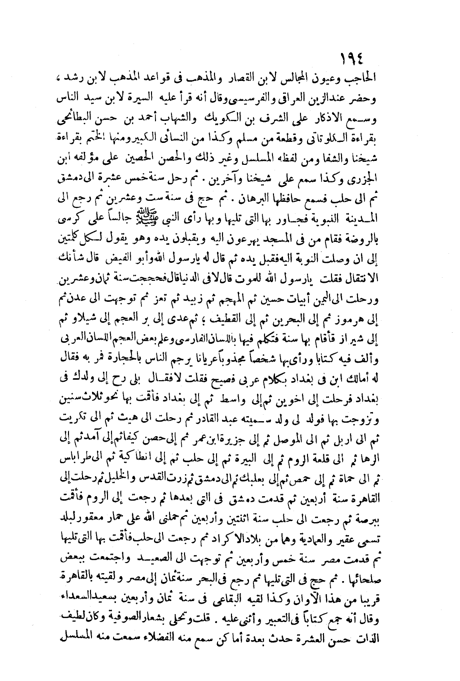 الله وَأَبُو الْفَيْض قَالَ شَأْنك الِانْتِقَال فَقلت يَا رَسُول الله للْمَوْت قَالَ لَا فِي الدُّنْيَا قَالَ فحججت سنة ثَمَان وَعشْرين ورحلت إِلَى الْيمن أَبْيَات حُسَيْن ثمَّ المهجم ثمَّ زبيد ثمَّ تعز ثمَّ تَوَجَّهت إِلَى عدن ثمَّ إِلَى هرموز ثمَّ إِلَى الْبَحْرين ثمَّ إِلَى القطيف ثمَّ عدي إِلَى بر الْعَجم إِلَى شيلاو ثمَّ إِلَى شيراز فَأَقَامَ بهَا سنة فَتكلم فِيهَا بِاللِّسَانِ الْفَارِسِي وَعلم بعض الْعَجم اللِّسَان الْعَرَبِيّ وَألف فِيهِ كتابا وَرَأى بهَا شخصا مجذوبا عُريَانا يرْجم النَّاس بِالْحِجَارَةِ فَمر بِهِ فَقَالَ لَهُ أمالك ابْن فِي بَغْدَاد بِكَلَام عَرَبِيّ فصيح فَقلت لَا فَقَالَ بلَى رح إِلَى ولدك فِي بَغْدَاد فرحلت إِلَى أَخَوَيْنِ ثمَّ إِلَى وَاسِط ثمَّ إِلَى بَغْدَاد فأقمت بهَا نَحْو ثَلَاث سِنِين وَتَزَوَّجت بهَا فولد لي ولد سميته عبد الْقَادِر ثمَّ رحلت إِلَى هيت ثمَّ إِلَى تكريت ثمَّ إِلَى إربل ثمَّ إِلَى الْموصل ثمَّ إِلَى جَزِيرَة ابْن عمر ثمَّ إِلَى حصن كيفا ثمَّ إِلَى آمد ثمَّ إِلَى الرها ثمَّ إِلَى قلعة الرّوم ثمَّ إِلَى البيرة ثمَّ إِلَى حلب ثمَّ إِلَى أنطاكية ثمَّ إِلَى طرابلس ثمَّ إِلَى حماة ثمَّ إِلَى حمص ثمَّ إِلَى بعلبك ثمَّ إِلَى دمشق ثمَّ زرت الْقُدس والخليل ثمَّ رحلت إِلَى القاهر سنة أَرْبَعِينَ ثمَّ قدمت دمشق فِي الَّتِي بعْدهَا ثمَّ رجعت إِلَى الرّوم فأقمت ببرصة ثمَّ رجعت إِلَى حلب سنة اثْنَتَيْنِ وَأَرْبَعين ثمَّ حَملَنِي الله على حمَار معقور لبلد تسمى عقير والعمادية وهما من بِلَاد الأكراد ثمَّ رجعت إِلَى حلب فأقمت بهَا الَّتِي تَلِيهَا ثمَّ قدمت مصر سنة خمس وَأَرْبَعين ثمَّ تَوَجَّهت إِلَى الصَّعِيد وَاجْتمعت بِبَعْض صلحائها. ثمَّ حج فِي الَّتِي تَلِيهَا ثمَّ رَجَعَ فِي الْبَحْر سنة ثَمَان إِلَى مصر ولقيته بِالْقَاهِرَةِ قَرِيبا من هَذَا الأوان وَكَذَا لقِيه البقاعي فِي سنة ثَمَان وَأَرْبَعين بِسَعِيد السُّعَدَاء وَقَالَ إِنَّه جمع كتابا فِي التَّعْبِير وَأثْنى عَلَيْهِ. قلت وتحلى بشعار الصُّوفِيَّة وَكَانَ لطيف الذَّات حسن الْعشْرَة حدث بعدة أَمَاكِن سمع مِنْهُ الْفُضَلَاء سَمِعت مِنْهُ المسلسل