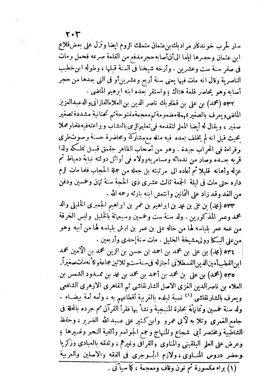 الْحجَّة سنة ثَمَان وَخمسين وَدفن من الْغَد وَقد زَاد على الثَّمَانِينَ وانتعش ابْنه بإرثه رَحمَه الله. مُحَمَّد بن عَليّ بن مُحَمَّد بن إِبْرَاهِيم بن عمر بن إِبْرَاهِيم الجعبري الخليلي وَالِد مُحَمَّد وَعمر الْمَذْكُورين. ولد سنة سِتّ وَخمسين وَسَبْعمائة بالخليل وَلبس الْخِرْقَة من عَمه عمر بلباسه لَهَا من خَاله عَليّ بن عمر بن أرش بلباسه لَهَا من أَبِيه وَهُوَ من على البكا وَولي مشيخة الْخَلِيل. مَاتَ سنة إِحْدَى وَأَرْبَعين. مُحَمَّد بن عَليّ بن مُحَمَّد بن أَحْمد بن حسن بن الزين مُحَمَّد بن الْأمين مُحَمَّد ابْن القطب أَمِين الدّين الْقُسْطَلَانِيّ أجَاز لَهُ فِي سنة سِتّ وَثَلَاثِينَ جمَاعَة وَكَأَنَّهُ مَاتَ صَغِيرا. مُحَمَّد بن عَليّ بن مُحَمَّد بن أَحْمد بن مُحَمَّد بن مُحَمَّد بن مَمْدُود الشَّمْس بن الْعَلَاء بن نَاصِر الدّين الْغَزِّي الأَصْل الشارنقاشي ثمَّ القاهري الْأَزْهَرِي الشَّافِعِي وَيعرف بالشارنقاشي نِسْبَة لبلده بالغربية أقطاعهم بِهِ، وَأمه أمة بَيْضَاء. ولد سنة خمسين وَثَمَانمِائَة بحارة المنبجية وَنَشَأ بهَا فَقَرَأَ الْقُرْآن ثمَّ جرده بالحلة فِي جَامع الغمري وتلا بِهِ لأبي عَمْرو وَابْن كثير على عبد الله الضَّرِير، وَحفظ الشاطبية ومختصر أبي شُجَاع والمنهاج وَجمع الْجَوَامِع وألفية النَّحْو وَغَيرهَا وَعرض على الْعلم البُلْقِينِيّ والمناوي والقرافي وَغَيرهم، وتفقه بالعبادي وزَكَرِيا وَحضر دروس الْمَنَاوِيّ، ولازم الْجَوْجَرِيّ فِي الْفِقْه والأصلين والعربية