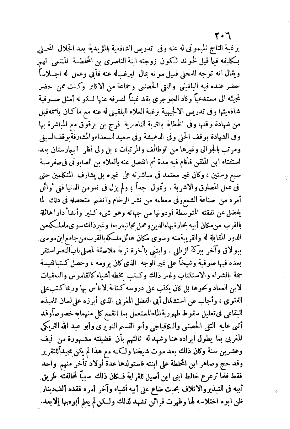 وثمول جدا وَلم يزل فِي نمو من الدُّنْيَا فَفِي أَوَائِل أمره من صناعَة الشمع وَفِي معظمه من نشر الرخام وانضم متحصله فِي ذَلِك لما يفضل عَن نَفَقَته المتوسطة أَو دونهَا من جهاته وَهُوَ شَيْء كثير وَأَنْشَأَ دَارا هائلة بِالْقربِ من مَكَان أَبِيه بحارة بهاء الدّين وَعمر بجانبه ربعا وَغير ذَلِك سوى مَا ملكه من الدّور الْمُقَابلَة لَهُ والقريبة مِنْهُ وَسوى مَكَان هائل ملكه بِالْقربِ من جَامع ابْن مُوسَى ببولاق وَآخر ببركة الرطلي. وابتنى بِأخرَة تربة ملاصقة لمصلى بَاب النَّصْر اسْتَقر بعده فِيهَا صوفية وشيخا على غير الْوَجْه الَّذِي كَانَ يرومه، وَحصل كتبا نفيسة جمة بِالشِّرَاءِ والاستكتاب وَغير ذَلِك وَكتب بِخَطِّهِ أَشْيَاء كالقاموس والتعقبات لِابْنِ الْعِمَاد وَنَحْوهَا بل كَانَ يكْتب على دروسه كِتَابَة لَا بَأْس بهَا وَرُبمَا كتب على الفتوي، وَأجَاب عَن استشكال أبي الْفضل المغربي الَّذِي أبرزه على لِسَان تِلْمِيذه البقاعي فِي تَعْلِيل سُقُوط طهورية المَاء الْمُسْتَعْمل بِمَا انقمع كل مِنْهُمَا بِهِ خُصُوصا وَقد أثنى عَلَيْهِ التقي الحصني والكافياجي وَأَبُو الْقسم النويري وَأَبُو عبد الله التريكي المغربي بِمَا يطول إِيرَاده هُنَا وَشهد لَهُ ثالثهم بِأَن فضيلته مَشْهُورَة من نَيف وَعشْرين سنة وَكَانَ ذَلِك بعد موت شَيخنَا وَلكنه مَعَ هَذَا لم يكن مجيدا للتقرير وَقد حج وصاهر ابْن المخلطة على ابْنَته فاستولدها عدَّة أَوْلَاد تَأَخّر مِنْهُم وَاحِد فَقَط فَلَمَّا ترعرع خالط ابْني ابْن أصيل لِلْقَرَابَةِ فَكَانَ ذَلِك سَببا لمُخَالفَته طَرِيق أَبِيه فِي التبذير والأتلاف بِحَيْثُ ضَاعَ على أَبِيه أَشْيَاء وَآخر أمره فَقده ألف دِينَار ظن أَبوهُ اختلاسه لَهَا وَظَهَرت قَرَائِن تشهد لذَلِك وَلَكِن لم يعلم أَبوهُ بهَا إِلَّا بعد