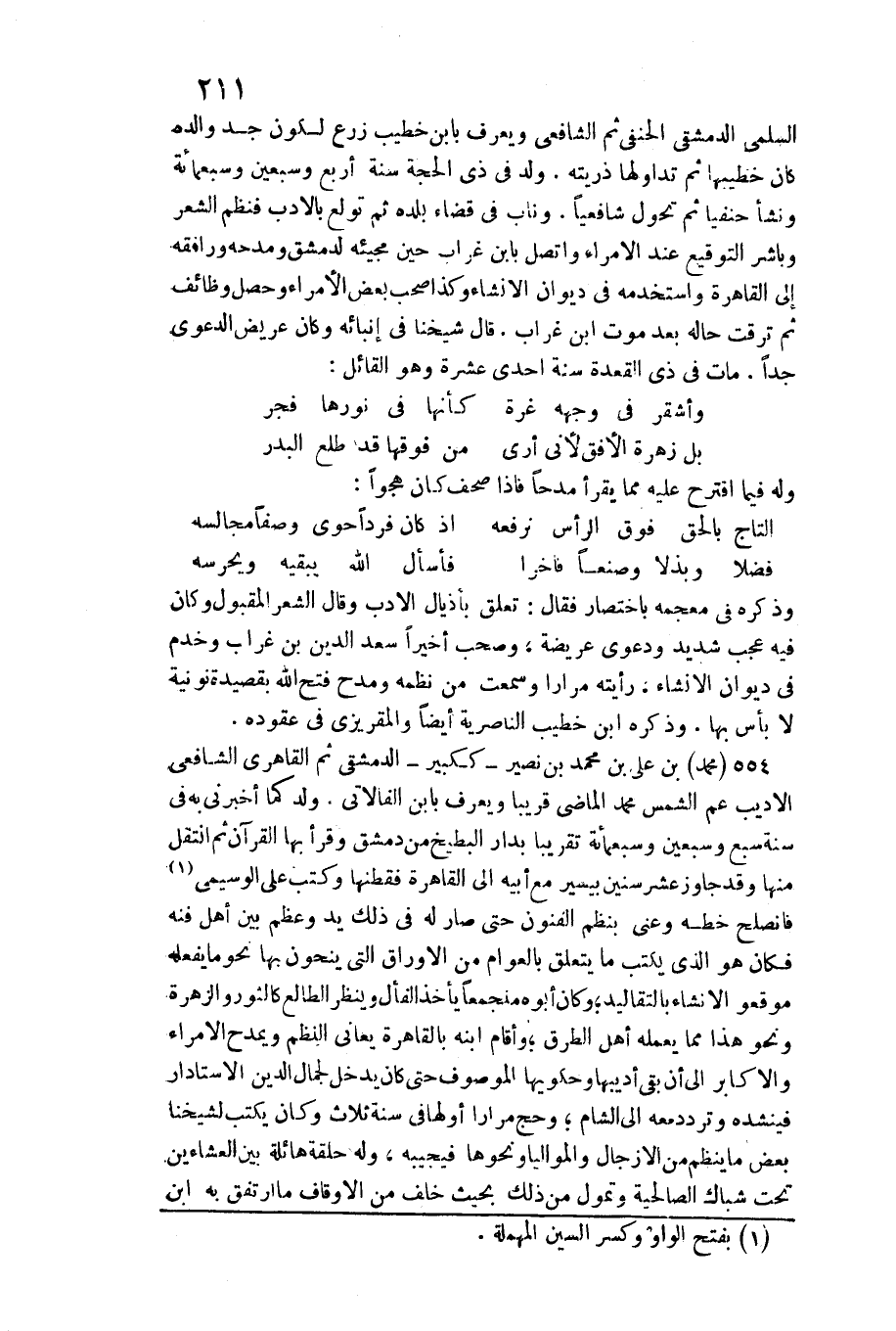 وَذكره فِي مُعْجَمه بِاخْتِصَار فَقَالَ: تعلق بأذيال الْأَدَب وَقَالَ الشّعْر المقبول وَكَانَ فِيهِ عجب شَدِيد وَدَعوى عريضة، وَصَحب أخيرا سعد الدّين بن غراب وخدم فِي ديوَان الْإِنْشَاء، رَأَيْته مرَارًا وَسمعت من نظمه ومدح فتح الله بقصيدة نونية لَا بَأْس بهَا. وَذكره ابْن خطيب الناصرية أَيْضا والمقريزي فِي عقوده. مُحَمَّد بن عَليّ بن مُحَمَّد بن نصير ككبير الدِّمَشْقِي ثمَّ القاهري الشَّافِعِي الأديب عَم الشَّمْس مُحَمَّد الْمَاضِي قَرِيبا وَيعرف بِابْن الفالاتي. ولد كَمَا أَخْبرنِي بِهِ فِي سنة سبع وَسبعين وَسَبْعمائة تَقْرِيبًا بدار الْبِطِّيخ من دمشق وَقَرَأَ بهَا الْقُرْآن ثمَّ انْتقل مِنْهَا وَقد جَاوز عشر سِنِين بِيَسِير مَعَ أَبِيه إِلَى الْقَاهِرَة فقطنها وَكتب على الوسيمي فانصلح خطه وعني بنظم الْفُنُون حَتَّى صَار لَهُ فِي ذَلِك يَد وَعظم بَين أهل فنه فَكَانَ هُوَ الَّذِي يكْتب مَا يتَعَلَّق بالعوام من الأوراق الَّتِي ينحون بهَا نَحْو مَا يَفْعَله موقعو الْإِنْشَاء بالتقاليد وَكَانَ أَبوهُ منجمعا يَأْخُذ الفأل وَينظر الطالع كالثور والزهرة وَنَحْو هَذَا مِمَّا يعمله أهل الطّرق واقام ابْنه بِالْقَاهِرَةِ يعاني النّظم ويمدح الإمراء والأكابر إِلَى أَن بَقِي أديبها وحكويها الْمَوْصُوف حَتَّى كَانَ يدْخل لجمال الدّين الاستادار فينشده وَتردد مَعَه إِلَى الشَّام وَحج مرَارًا أَولهَا فِي سنة ثَلَاث وَكَانَ يكْتب لشَيْخِنَا بعض مَا ينظم من الأزجال والمواليا وَنَحْوهَا فَيُجِيبهُ، وَله حَلقَة هائلة بَين العشاءين تَحت شباك الصالحية وتمول من ذَلِك بحث خلف من الْأَوْقَاف مَا ارتفق بِهِ ابْن