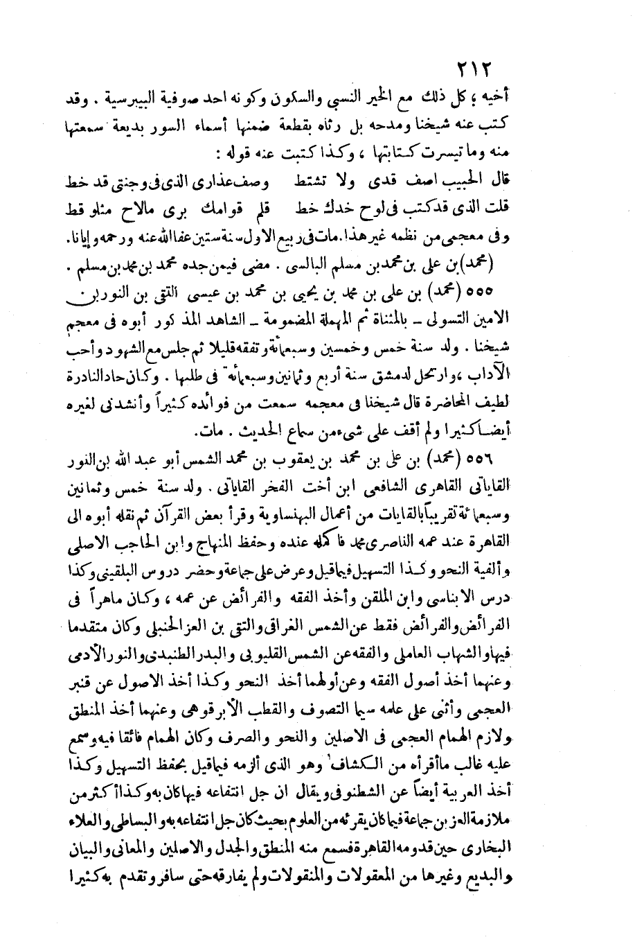 مُحَمَّد بن عَليّ بن مُحَمَّد بن مُسلم البالسي. مضى فِيمَن جده مُحَمَّد بن مُحَمَّد بن مُسلم. مُحَمَّد بن عَليّ بن مُحَمَّد بن يحيى بن مُحَمَّد بن عِيسَى التقي بن النوربن الْأمين التسولي بِالْمُثَنَّاةِ ثمَّ الْمُهْملَة المضمومة الشَّاهِد الْمَذْكُور أَبوهُ فِي مُعْجم شَيخنَا. ولد سنة خمس وَخمسين وَسَبْعمائة وتفقه قَلِيلا ثمَّ جلس مَعَ الشُّهُود وَأحب الْآدَاب، وارتحل لدمشق سنة أَربع وَثَمَانِينَ وَسَبْعمائة فِي طلبَهَا. وَكَانَ حاد النادرة لطيف المحاضرة قَالَ شَيخنَا فِي مُعْجَمه سَمِعت من فَوَائده كثيرا وأنشدني لغيره أَيْضا كثيرا وَلم أَقف على شَيْء من سَماع الحَدِيث. مَاتَ. مُحَمَّد بن عَليّ بن مُحَمَّد بن يَعْقُوب بن مُحَمَّد الشَّمْس أَبُو عبد الله بن النُّور القاياتي القاهري الشَّافِعِي ابْن أُخْت الْفَخر القاياتي. ولد سنة خمس وَثَمَانِينَ وَسَبْعمائة تَقْرِيبًا بالقايات من أَعمال البهنساوية وَقَرَأَ بعض الْقُرْآن ثمَّ نَقله أَبوهُ إِلَى الْقَاهِرَة عِنْد عَمه الناصري مُحَمَّد فأكمله عِنْده وَحفظ الْمِنْهَاج وَابْن الْحَاجِب الْأَصْلِيّ وألفية النَّحْو وَكَذَا التسهيل فِيمَا قيل وَعرض على جمَاعَة وَحضر دروس البُلْقِينِيّ وَكَذَا درس الأبناسي وَابْن الملقن وَأخذ الْفِقْه والفرائض عَن عَمه، وَكَانَ ماهرا فِي الْفَرَائِض والفرائض فَقَط عَن الشَّمْس الغراقي والتقي بن الْعِزّ الْحَنْبَلِيّ وَكَانَ مُتَقَدما فِيهَا والشهاب العاملي وَالْفِقْه عَن الشَّمْس القليوبي والبدر الطنبدي والنور الأدمِيّ وعنهما أَخذ أصُول الْفِقْه وَعَن أَولهمَا أَخذ النَّحْو وَكَذَا أَخذ الْأُصُول عَن قنبر العجمي وَأثْنى على علمه سِيمَا التصوف والقطب الأبرقوهي وعنهما أَخذ الْمنطق ولازم الْهمام العجمي فِي الْأَصْلَيْنِ والنحو وَالصرْف وَكَانَ الْهمام فائقا فِيهِ وَسمع عَلَيْهِ غَالب مَا أقرأه من الْكَشَّاف وَهُوَ الَّذِي ألزمهُ فِيمَا قيل بِحِفْظ التسهيل وَكَذَا أَخذ الْعَرَبيَّة أَيْضا عَن الشطنوفي وَيُقَال إِن جلّ انتفاعه فِيهَا كَانَ بِهِ وَكَذَا أَكثر من مُلَازمَة الْعِزّ بن جمَاعَة فِيمَا كَانَ يقرئه من الْعُلُوم بِحَيْثُ كَانَ جلّ انتفاعه بِهِ والبساطي والْعَلَاء البُخَارِيّ حِين قدومه الْقَاهِرَة)