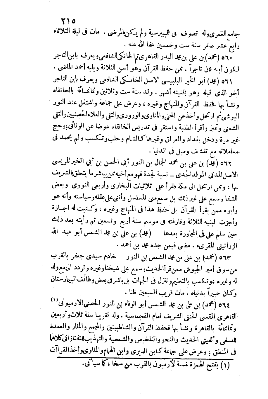 بالتعليم وتنزل فِي الْجِهَات بل بَاشر فِي بعض وظائف البيمارستان وَكَانَ خَبِيرا بدنياه. مَاتَ قريب السّبْعين ظنا. مُحَمَّد بن عَليّ بن مُحَمَّد الشَّمْس أَبُو الْوَفَاء بن النُّور الحصني الأرميوني القاهري المقسي الْحَنَفِيّ الشريف إِمَام القجماسية. ولد تَقْرِيبًا سنة ثَلَاث وَأَرْبَعين وَثَمَانمِائَة بِالْقَاهِرَةِ وَنَشَأ بهَا فحفظ الْقُرْآن والشاطبيتين وَالْمجْمَع والمنار والعمدة للنسفي وألفيتي الحَدِيث والنحو وَالتَّلْخِيص والشمسية والتهذيب للتفتازاني كِلَاهُمَا فِي الْمنطق وَعرض على جمَاعَة كَابْن الديري وَابْن الْهمام والمناوي وَأخذ القراآت