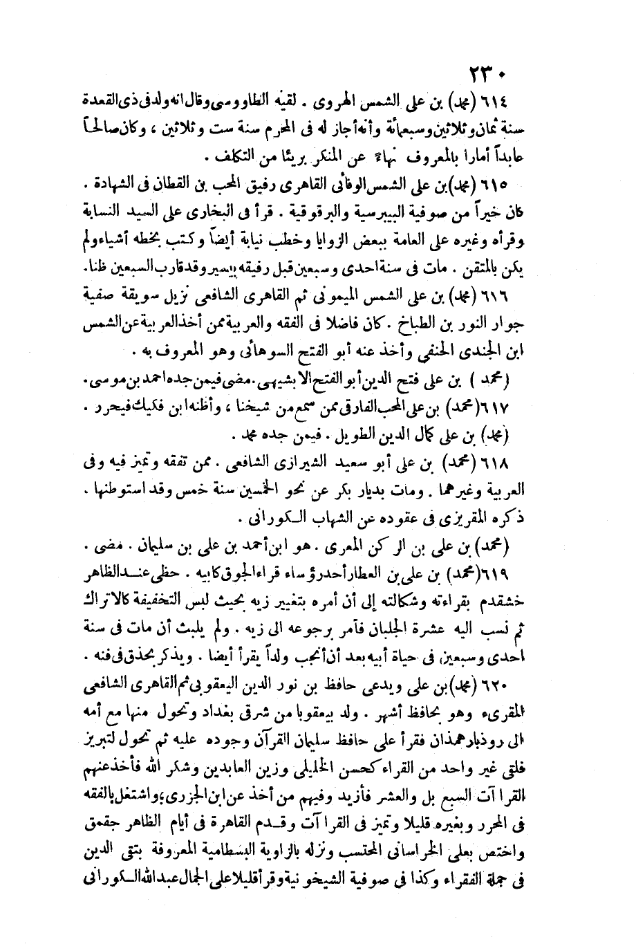 مُحَمَّد بن عَليّ الشَّمْس الْهَرَوِيّ. لقِيه الطاووسي وَقَالَ إِنَّه ولد فِي ذِي الْقعدَة سنة ثَمَان وَثَلَاثِينَ وَسَبْعمائة وَأَنه أجَاز لَهُ فِي الْمحرم سنة سِتّ وَثَلَاثِينَ، وَكَانَ صَالحا عابدا أمارا بِالْمَعْرُوفِ نهاء عَن الْمُنكر بَرِيئًا من التَّكَلُّف. مُحَمَّد بن عَليّ الشَّمْس الوفائي القاهري رَفِيق الْمُحب بن الْقطَّان فِي الشَّهَادَة. كَانَ خيرا من صوفية البيبرسية والبرقوقية. قَرَأَ فِي البُخَارِيّ على السَّيِّد النسابة وقرأه وَغَيره على الْعَامَّة بِبَعْض الزوايا وخطب نِيَابَة أَيْضا وَكتب بِخَطِّهِ أَشْيَاء وَلم يكن بالمتقن. مَاتَ فِي سنة إِحْدَى وَسبعين قبل رَفِيقه بِيَسِير وَقد قَارب السّبْعين ظنا. مُحَمَّد بن عَليّ الشَّمْس الْمَيْمُونِيّ ثمَّ القاهري الشَّافِعِي نزيل سويقة صَفِيَّة جوَار النُّور بن الطباخ. كَانَ فَاضلا فِي الْفِقْه والعربية مِمَّن أَخذ الْعَرَبيَّة عَن الشَّمْس ابْن الجندي الْحَنَفِيّ وَأخذ عَنهُ أَبُو الْفَتْح السوهائي وَهُوَ الْمَعْرُوف بِهِ.)