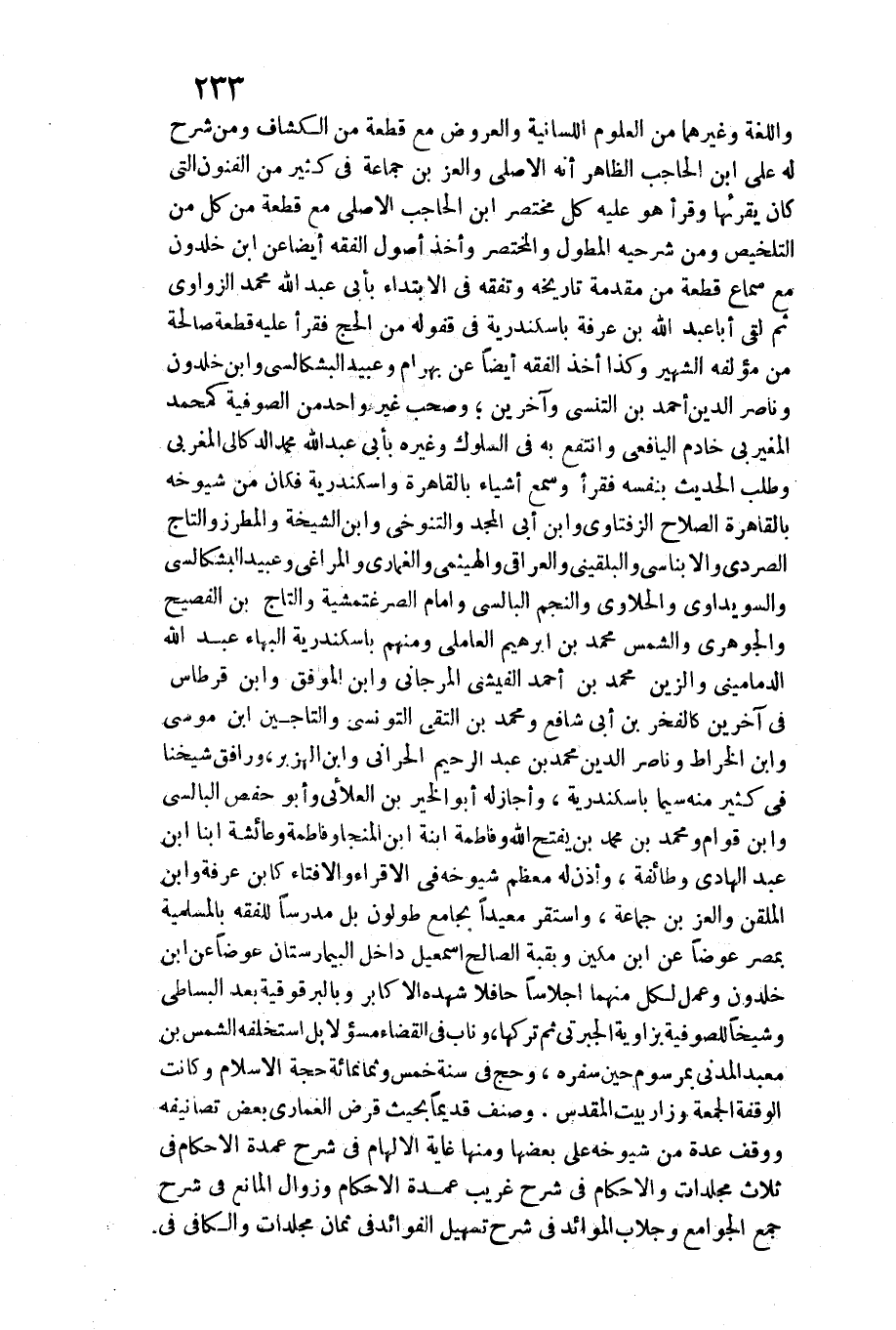 واللغة وَغَيرهمَا من الْعُلُوم اللسانية وَالْعرُوض مَعَ قِطْعَة من الْكَشَّاف وَمن شرح لَهُ على ابْن الْحَاجِب الظَّاهِر أَنه الْأَصْلِيّ والعز بن جمَاعَة فِي كثير من الْفُنُون الَّتِي كَانَ يقرئها وَقَرَأَ هُوَ عَلَيْهِ كل مُخْتَصر ابْن الْحَاجِب الْأَصْلِيّ مَعَ قِطْعَة من كل من التَّلْخِيص وَمن شرحيه المطول والمختصر وَأخذ أصُول الْفِقْه أَيْضا عَن ابْن خلدون مَعَ)