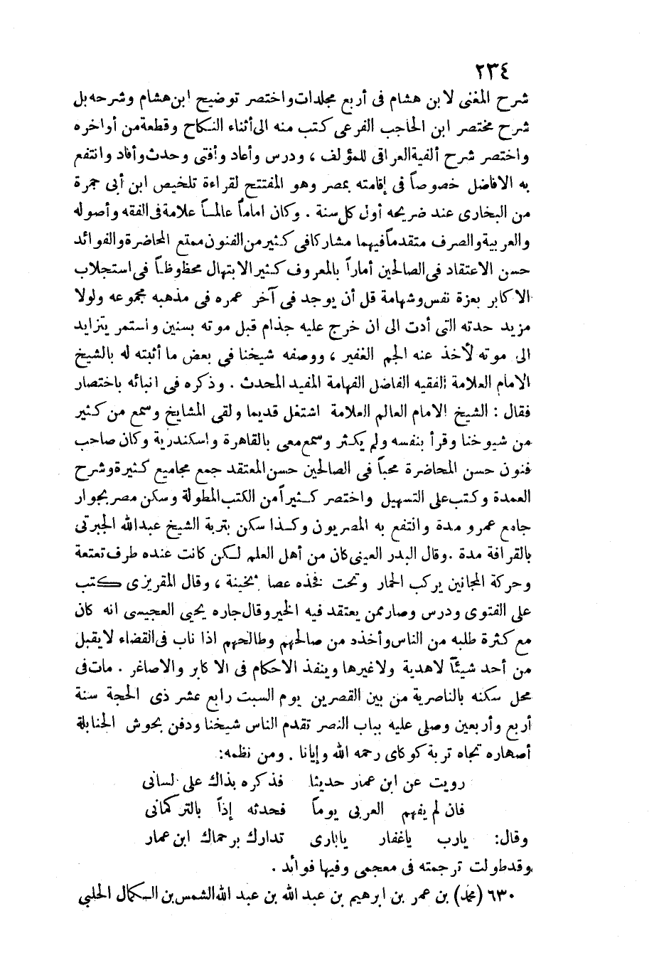 ألفية الْعِرَاقِيّ للمؤلف، ودرس وَأعَاد وَأفْتى وَحدث وَأفَاد وانتفع بِهِ الأفاضل خُصُوصا فِي إِقَامَته بِمصْر وَهُوَ المفتتح لقِرَاءَة تَلْخِيص ابْن أبي جَمْرَة من البُخَارِيّ عِنْد ضريحه أول كل سنة. وَكَانَ إِمَامًا عَالما عَلامَة فِي الْفِقْه وأصوله والعربية وَالصرْف مُتَقَدما فيهمَا مشاركا فِي كثير من الْفُنُون ممتع المحاضرة الْفَوَائِد حسن الِاعْتِقَاد فِي الصَّالِحين أمارا بِالْمَعْرُوفِ كثير الابتهال محظوظا فِي استجلاب الأكابر بعزة نفس وشهامة قل أَن يُوجد فِي آخر عمره فِي مذْهبه مَجْمُوعه وَلَوْلَا مزِيد حِدته الَّتِي أدَّت إِلَى أَن خرج عَلَيْهِ جذام قبل مَوته بسنين وَاسْتمرّ يتزايد إِلَى مَوته لأخذ عَنهُ الجم الْغَفِير، وَوَصفه شَيخنَا فِي بعض مَا أثْبته لَهُ بالشيخ الإِمَام الْعَلامَة الْفَقِيه الْفَاضِل الفهامة الْمُفِيد الْمُحدث. وَذكره فِي إنبائه بِاخْتِصَار فَقَالَ: الشَّيْخ الإِمَام الْعَالم الْعَلامَة اشْتغل قَدِيما وَلَقي الْمَشَايِخ وَسمع من كثير من شُيُوخنَا وَقَرَأَ بِنَفسِهِ وَلم يكثر وَسمع معي بِالْقَاهِرَةِ واسكندرية وَكَانَ صَاحب فنون حسن المحاضرة محبا فِي الصَّالِحين حسن المعتقد جمع مجاميع كَثِيرَة وَشرح الْعُمْدَة وَكتب على التسهيل وَاخْتصرَ كثيرا من الْكتب المطولة وَسكن مصر بجوار جَامع عَمْرو مُدَّة وانتفع بِهِ المصريون وَكَذَا سكن بتربة الشَّيْخ عبد الله الجبرتي بالقرافة مُدَّة. وَقَالَ الْبَدْر الْعَيْنِيّ كَانَ من أهل الْعلم لَكِن كَانَت عِنْده طرف تعتعة وحركة المجانين يركب الْحمار وَتَحْت فَخذه عَصا ثخينة، وَقَالَ المقريزي كتب على الْفَتْوَى ودرس وَصَارَ مِمَّن يعْتَقد فِيهِ الْخَيْر وَقَالَ جَاره يحيى العجيسي إِنَّه كَانَ مَعَ كَثْرَة طلبه من النَّاس وَأَخذه من صَالحهمْ وطالحهم إِذا نَاب فِي الْقَضَاء لَا يقبل من أحد شَيْئا لَا هَدِيَّة وَلَا غَيرهَا وَينفذ الْأَحْكَام فِي الأكابر والأصاغر. مَاتَ فِي مَحل سكنه بالناصرية من بَين القصرين يَوْم السبت رَابِع عشر ذِي الْحجَّة سنة أَربع وَأَرْبَعين وَصلي عَلَيْهِ بِبَاب النَّصْر تقدم النَّاس شَيخنَا وَدفن بحوش الْحَنَابِلَة أصهاره تجاه تربة كوكاي رَحمَه الله وإيانا. وَمن نظمه: