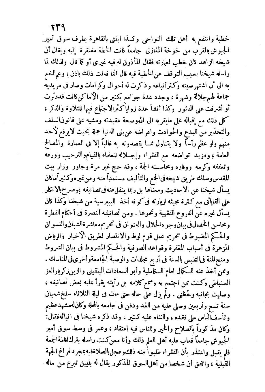خطْبَة وانتفع بِهِ أهل تِلْكَ النواحي وَكَذَا ابْنَتي بِالْقَاهِرَةِ بِطرف سوق أَمِير الجيوش بِالْقربِ من خوخة المغازلي جَامعا كَانَت الخطة مفتقرة إِلَيْهِ وَيُقَال أَن شَيْخه الزَّاهِد كَانَ خطب لعمارته فَقَالَ الْمَأْذُون لَهُ فِيهِ غَيْرِي أَو كَمَا قَالَ وَلذَلِك لما راسله شَيخنَا بِسَبَب التَّوَقُّف عَن الْخطْبَة فِيهِ قَالَ إِنَّمَا فعلت ذَلِك بِإِذن وَعم النَّفْع بِهِ إِلَى أَن اشْتهر صيته وَكثر أَتْبَاعه وَذكرت لَهُ أَحْوَال وكرامات وَصَارَ فِي مريديه جمَاعَة لَهُم جلالة وشهرة، وجدد عدَّة جَوَامِع بِكَثِير من الْأَمَاكِن كَانَت قد دثرت أَو أشرفت على الدُّثُور وَكَذَا أنشأ عدَّة زَوَايَا كثر الِاجْتِمَاع فِيهَا للتلاوة وَالذكر، كل ذَلِك مَعَ إقباله على مَا يقربهُ إِلَى الله وَصِحَّة عقيدته ومشيه على قانون السّلف والتحذير من الْبدع والحوادث وإعراضه عَن بني الدُّنْيَا جملَة بِحَيْثُ لَا يرفع لأحد مِنْهُم وَلَو عظم رَأْسا وَلَا يتَنَاوَل مِمَّا يقصدونه بِهِ غَالِبا إِلَّا فِي الْعِمَارَة والمصالح الْعَامَّة ومزيد تواضعه مَعَ الْفُقَرَاء وإجلاله للْعُلَمَاء بِالْقيامِ والترحيب وورعه وتعففه وَكَرمه ووقاره ومحاسنه الجمة، وَقد حج غير مرّة وجاور وزار بَيت الْمُقَدّس وسلك طَرِيق شَيْخه فِي الْجمع والتأليف مستمدا مِنْهُ وَمن غَيره وَكَثِيرًا مَا كَانَ يسْأَل شَيخنَا عَن الْأَحَادِيث وَمَعْنَاهَا بل رُبمَا ينْقل عَنهُ فِي تصانيفه وَصرح بالإنكار على القاياتي مَعَ كَثْرَة مَجِيئه لزيارته فِي كَونه أَخذ البيبرسية من شَيخنَا وَكَذَا كَانَ يسْأَل غَيره عَن الْفُرُوع الْفِقْهِيَّة وَنَحْوهَا. وَمن تصانيفه النُّصْرَة فِي أَحْكَام الْفطْرَة ومحاسن الْخِصَال فِي بَيَان وُجُوه الْحَلَال والعنوان فِي تَحْرِيم معاشرة الشبَّان والنسوان وَالْحكم المضبوط فِي تَحْرِيم عملل قوم لوط والانتصار لطريق الأخيار والرياض المزهرة فِي أَسبَاب الْمَغْفِرَة وقواعد الصُّوفِيَّة وَالْحكم الْمَشْرُوط فِي بَيَان الشُّرُوط ومنح الْمِنَّة فِي التَّلَبُّس بِالسنةِ فِي أَربع مجلدات وَالْوَصِيَّة)