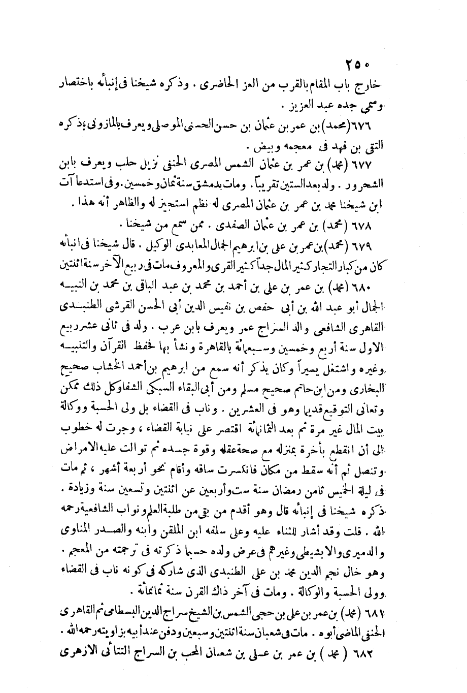 الطنبدي الَّذِي شَاركهُ فِي كَونه نَاب فِي الْقَضَاء وَولي الْحِسْبَة وَالْوكَالَة. وَمَات فِي آخر ذَاك الْقرن سنة ثَمَانمِائَة. مُحَمَّد بن عمر بن عَليّ بن حجي الشَّمْس بن الشَّيْخ سراج الدّين البسطامي ثمَّ القاهري الْحَنَفِيّ الْمَاضِي أَبوهُ. مَاتَ فِي شعْبَان سنة اثْنَتَيْنِ وَسبعين وَدفن عِنْد أَبِيه بزاويته رَحمَه الله. مُحَمَّد بن عمر بن عَليّ بن شعْبَان الْمُحب بن السراج التتائي الْأَزْهَرِي