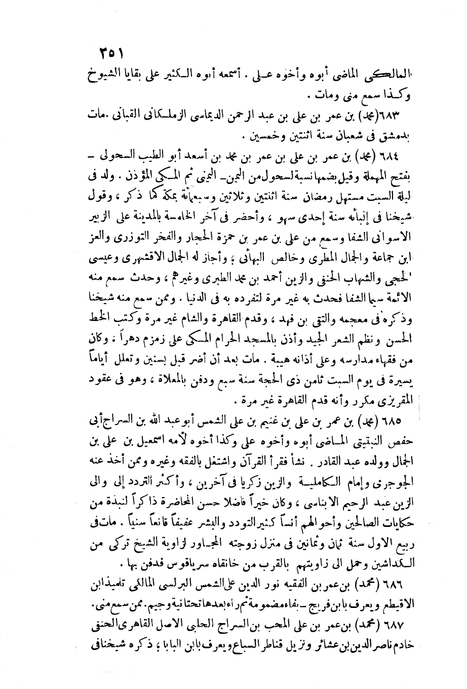 الْمَالِكِي الْمَاضِي أَبوهُ وَأَخُوهُ عَليّ. أسمعهُ أَبوهُ الْكثير على بقايا الشُّيُوخ وَكَذَا سمع مني وَمَات. مُحَمَّد بن عمر بن عَليّ بن عبد الرَّحْمَن الديماسي الزملكاني القباني. مَاتَ بِدِمَشْق فِي شعْبَان سنة اثْنَتَيْنِ وَخمسين. مُحَمَّد بن عمر بن عَليّ بن عمر بن مُحَمَّد بن أسعد أَبُو الطّيب السحولي بِفَتْح الْمُهْملَة وَقيل بضَمهَا نِسْبَة لسحول من الْيمن اليمني ثمَّ الْمَكِّيّ الْمُؤَذّن. ولد فِي لَيْلَة السبت مستهل رَمَضَان سنة اثْنَتَيْنِ وَثَلَاثِينَ وَسَبْعمائة بِمَكَّة كَمَا ذكر، وَقَول شَيخنَا فِي إنبائه سنة إِحْدَى سَهْو، وأحضر فِي آخر الْخَامِسَة بِالْمَدِينَةِ على الزبير الأسواني الشفا وَسمع من عَليّ بن عمر بن حَمْزَة الحجار وَالْفَخْر التوزري والعز ابْن جمَاعَة وَالْجمال المطري وخالص البهائي وَأَجَازَ لَهُ الْجمال الأقشهري وعيشى الحجي والشهاب الْحَنَفِيّ والزين أَحْمد بن مُحَمَّد الطَّبَرِيّ وَغَيرهم، وَحدث سمع من الْأَئِمَّة سِيمَا الشفا فَحدث بِهِ غير مرّة لِتَفَرُّدِهِ بِهِ فِي الدُّنْيَا. وَمِمَّنْ سمع مِنْهُ شَيخنَا وَذكره فِي مُعْجَمه والتقي بن فَهد، وَقدم الْقَاهِرَة وَالشَّام غير مرّة وَكتب الْخط الْحسن ونظم الشّعْر الْجيد وَأذن بِالْمَسْجِدِ الْحَرَام الْمَكِّيّ على زَمْزَم دهرا، وَكَانَ من فُقَهَاء مدارسه وعَلى أَذَانه هَيْبَة. مَاتَ بعد أَن أضرّ قبل بسنين وتعلل أَيَّامًا يسيرَة فِي يَوْم السبت ثامن ذِي الْحجَّة سنة سبع وَدفن بالمعلاة، وَهُوَ فِي عُقُود المقريزي مُكَرر وَأَنه قدم الْقَاهِرَة غير مرّة. مُحَمَّد بن عمر بن عَليّ بن غنيم بن عَليّ الشَّمْس أَبُو عبد الله بن السراج أبي حَفْص النبتيتي الْمَاضِي أَبوهُ وَأَخُوهُ عَليّ وَكَذَا أَخُوهُ لأمه إِسْمَاعِيل بن عَليّ بن الْجمال وَولده عبد الْقَادِر. نَشأ فَقَرَأَ الْقُرْآن واشتغل بالفقه وَغَيره وَمِمَّنْ أَخذ عَنهُ الْجَوْجَرِيّ وَإِمَام الكاملية والزين زَكَرِيَّا فِي آخَرين، وَأكْثر التَّرَدُّد إِلَيّ وَإِلَى الزين عبد الرَّحِيم الأبناسي، وَكَانَ خيرا فَاضلا حسن المحاضرة ذَاكِرًا لنبذة من حكايات الصَّالِحين وأحوالهم أنسا كثير التودد والبشر)