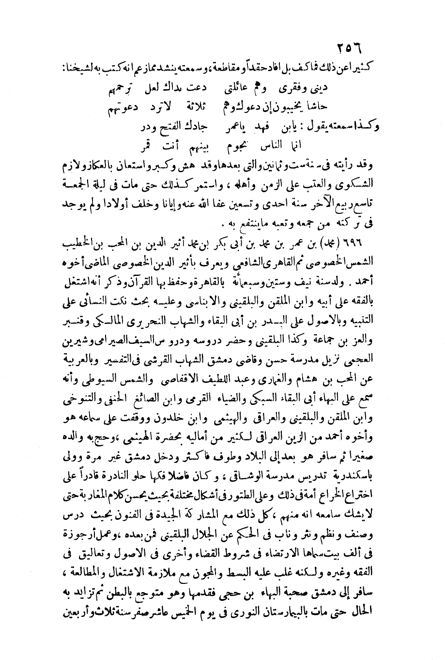 وَقد رَأَيْته فِي سنة سِتّ وَثَمَانِينَ وَالَّتِي بعْدهَا وَقد هش وَكبر واستعان بالعكاز ولازم الشكوى والعتب على الزَّمن وَأَهله، وَاسْتمرّ كَذَلِك حَتَّى مَاتَ فِي لَيْلَة الْجُمُعَة تَاسِع ربيع الآخر سنة إِحْدَى وَتِسْعين عَفا الله عَنهُ وإيانا وَخلف أَوْلَادًا وَلم يُوجد فِي تركته من جمعه وتعبه مَا ينْتَفع بِهِ. مُحَمَّد بن عمر بن مُحَمَّد بن أبي بكر بن مُحَمَّد أثير الدّين بن الْمُحب بن الْخَطِيب الشَّمْس الخصوصي ثمَّ القاهري الشَّافِعِي وَيعرف بأثير الدّين الخصوصي الْمَاضِي أَخُوهُ)