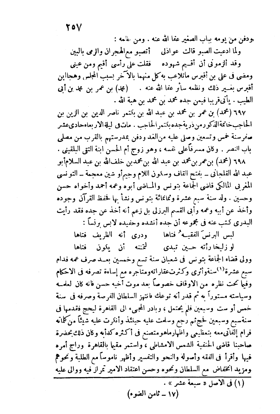بمدرستهم بِالْقربِ من مصلى بَاب النَّصْر. وَكَانَ مُسْرِفًا على نَفسه، وَهُوَ زوج أم الْحسن ابْنة التقي البُلْقِينِيّ. مُحَمَّد بن عمر بن مُحَمَّد بن عبد الله بن مُحَمَّد بن خلف الله بن عبد السَّلَام أَبُو عبد الله القلجاني بِفَتْح الْقَاف وَسُكُون اللَّام وجيم أَو شين مُعْجمَة التّونسِيّ المغربي الْمَالِكِي قَاضِي الْجَمَاعَة بتونس والماضي أَبوهُ وَعَمه أَحْمد وأخواه حسن وحسين. ولد سنة سبع عشرَة وَثَمَانمِائَة بتونس وَنَشَأ بهَا فحفظ الْقُرْآن وجوده وَأخذ عَن أَبِيه وَعَمه وَأبي الْقسم الْبُرْزُليّ بل زعم أَنه أَخذ عَن جده فقد رَأَيْت البدري كتب عَنهُ فِي مَجْمُوعه أَن جده أنْشدهُ وحفيده لابس برنسا: