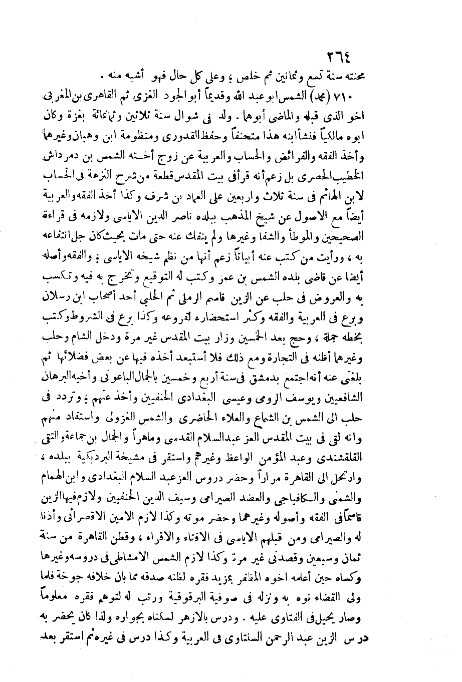 محنته سنة تسع وَثَمَانِينَ ثمَّ خلص وعَلى كل حَال فَهُوَ أشبه مِنْهُ. مُحَمَّد الشَّمْس أَبُو عبد الله وقديما أَبُو الْجُود الْغَزِّي ثمَّ القاهري بن المغربي أَخُو الَّذِي قبله والماضي أَبوهُمَا. ولد فِي شَوَّال سنة ثَلَاثِينَ وَثَمَانمِائَة بغزة وَكَانَ أَبوهُ مالكيا فَنَشَأَ ابْنه هَذَا متحنفا وَحفظ الْقَدُورِيّ ومنظومة ابْن وهبان وَغَيرهمَا وَأخذ الْفِقْه والفرائض والحساب والعربية عَن زوج أُخْته الشَّمْس بن دمرداش الْخَطِيب الحصري بل زعم أَنه قَرَأَ فِي بَيت الْمُقَدّس قِطْعَة من شرح النزهة فِي الْحساب لِابْنِ الهائم فِي سنة ثَلَاث وَأَرْبَعين على الْعِمَاد بن شرف وَكَذَا أَخذ الْفِقْه والعربية أَيْضا مَعَ الْأُصُول عَن شيخ الْمَذْهَب بِبَلَدِهِ نَاصِر الدّين الإياسي ولازمه فِي قِرَاءَة الصَّحِيحَيْنِ والموطأ والشفا وَغَيرهَا وَلم يَنْفَكّ عَنهُ حَتَّى مَاتَ بِحَيْثُ كَانَ جلّ انتفاعه بِهِ، وَرَأَيْت من كتب عَنهُ أبياتا زعم أَنَّهَا من نظم شَيْخه الإياسي وَالْفِقْه وَأَصله أَيْضا عَن قَاضِي بَلَده الشَّمْس بن عمر وَكتب لَهُ التوقيع وَتخرج بِهِ فِيهِ وتكسب بِهِ وَالْعرُوض فِي حلب عَن الزين قَاسم الرَّمْلِيّ ثمَّ الْحلَبِي أحد أَصْحَاب ابْن رسْلَان وبرع فِي الْعَرَبيَّة وَالْفِقْه وَكثر استحضاره لفروعه وَكَذَا برع فِي الشُّرُوط وَكتب بِخَطِّهِ جملَة، وَحج بعد الْخمسين وزار بَيت الْمُقَدّس غير مرّة وَدخل الشَّام وحلب وَغَيرهمَا أَظُنهُ فِي التِّجَارَة وَمَعَ ذَلِك فَلَا أستبعد أَخذه فِيهَا عَن بعض فضلائها ثمَّ بَلغنِي عَنهُ أَنه اجْتمع بِدِمَشْق فِي سنة أَربع وَخمسين بالجمال الباعوني وأخيه الْبُرْهَان الشافعيين ويوسف الرُّومِي وَعِيسَى الْبَغْدَادِيّ الحنفيين وَأخذ عَنْهُم وَتردد فِي حلب إِلَى الشَّمْس بن الشماع والْعَلَاء الحاضري وَالشَّمْس الغزولي واستفاد مِنْهُم وَإنَّهُ لَقِي فِي بَيت الْمُقَدّس الْعِزّ عبد السَّلَام الْقُدسِي وماهرا وَالْجمال بن جمَاعَة والتقي القلقشندي وَعبد الْمُؤمن الْوَاعِظ وَغَيرهم وَاسْتقر فِي مشيخة البردبكية بِبَلَدِهِ، وارتحل إِلَى الْقَاهِرَة مرَارًا وَحضر دروس الْعِزّ عبد السَّلَام الْبَغْدَادِيّ وَابْن الْهمام والشمني والكافياجي والعضد الصيرامي وَسيف الدّين الحنفيين ولازم فِيهَا الزين قاسما فِي الْفِقْه وأصوله وَغَيرهمَا وَحضر مَوته وَكَذَا لَازم الْأمين الأقصرائي وأذنا لَهُ والصيرامي وَمن قبلهم الإياسي فِي الْإِفْتَاء والإقراء، وقطن الْقَاهِرَة من سنة ثَمَان)