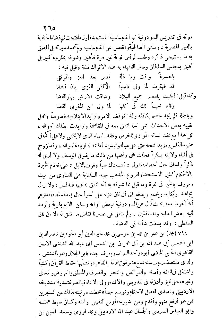وَبِالْجُمْلَةِ فَلم يجد خصما يُكَافِئهُ وَلذَا توقف الْأَمر وتزايد الِابْتِلَاء بِهِ خُصُوصا وَعمل نقيبه بعض الْأَحْدَاث مِمَّن لَعَلَّه اتّفق مَعَه فِي الْمُقَاسَمَة وتزايدت بذلك أَمْوَاله، كل هَذَا مَعَ عقد لِسَانه الموازي للخرس وفقد الْبَهَاء الَّذِي لَا يخفى وَلَا على أكمه فِي مزِيد الْغَلَس ومزيد شحه حَتَّى على عِيَاله وتبديد أَمَانَته لَهُ لزِيَادَة أَمْوَاله، وَقد تزوج فِي أثْنَاء ولَايَته بكرا فحكت هِيَ وَأَهْلهَا من ذَلِك مَا يفوق الْوَصْف وَلَا أرى لَهُ ذكرا ولسان حَال أخصامه يَقُول: أشبعناك سبا وفزت بِالْإِبِلِ على إِنَّه تَامّ الْخِبْرَة بِالْأَحْكَامِ كثير الاستحضار لفروع الْمَذْهَب جيد الْكِتَابَة على الْفَتَاوَى من بَيت مَعْرُوف بِالْخَيرِ فِي غَزَّة وَمَا قيل مِمَّا شوفه بِهِ أَنه اتّفق لَهُ فِيهَا فَبَاطِل، وَلَا زَالَ يُجَاهد ويكابد وَيجمع وَيدْفَع إِلَى أَن كَانَ عَزله على أَسْوَأ حَال بعد استصفاء مَا زعم أَنه آخر مَا مَعَه بِحَيْثُ نزل عَن السودونية لبَعض نوابه وَسكن الأبوبكرية وَتردد إِلَيْهِ بعض الطّلبَة والمستفتين وَلم يتَّفق فِي عصرنا لقاض مَا اتّفق لَهُ إِلَّا إِن كَانَ السفطي، وَقد بسطت شَأْنه فِي الْقُضَاة.) ::: مُحَمَّد بن عمر بن مُحَمَّد بن مُوسَى بن مُحَمَّد خير الدّين أَبُو الْجُود بن نَاصِر الدّين ابْن الشَّمْس أبي عبد الله بن أبي عمرَان بن الشَّمْس أبي عبد الله الشنشي الأَصْل القاهري الْحَنَفِيّ الْمَاضِي أَبوهُ وَأحد النواب وَيعرف جده بِابْن الْجلَال وَهُوَ بالشنشي. ولد فِي منتصف رَجَب سنة تسع عشرَة وَثَمَانمِائَة بِالْقَاهِرَةِ وَنَشَأ بهَا فحفظ الْقُرْآن وكتبا واشتغل فِي الْفِقْه وَأَصله ولافرائض والنحو وَالصرْف والمنطق وَالْعرُوض والمعاني وَغَيرهَا حَتَّى تميز وَأذن لَهُ فِي التدريس والإفتاء وَولي الْإِعَادَة بالصرغتمشية بعد شَيْخه الإردبيلي وتصدى لفصل الْأَحْكَام وَتوسع جدا فانحطت مرتبته بذلك عَن كثيرين مِمَّن هُوَ أرفع مِنْهُم وأقدم وَمن شُيُوخه الزين التفهني وَابْنه وَكَانَ سبط عمته وَأَبُو الْعَبَّاس السرسي وَالْجمال عبد الله الإردبيلي وَمُحَمّد الرُّومِي وَسعد الدّين بن