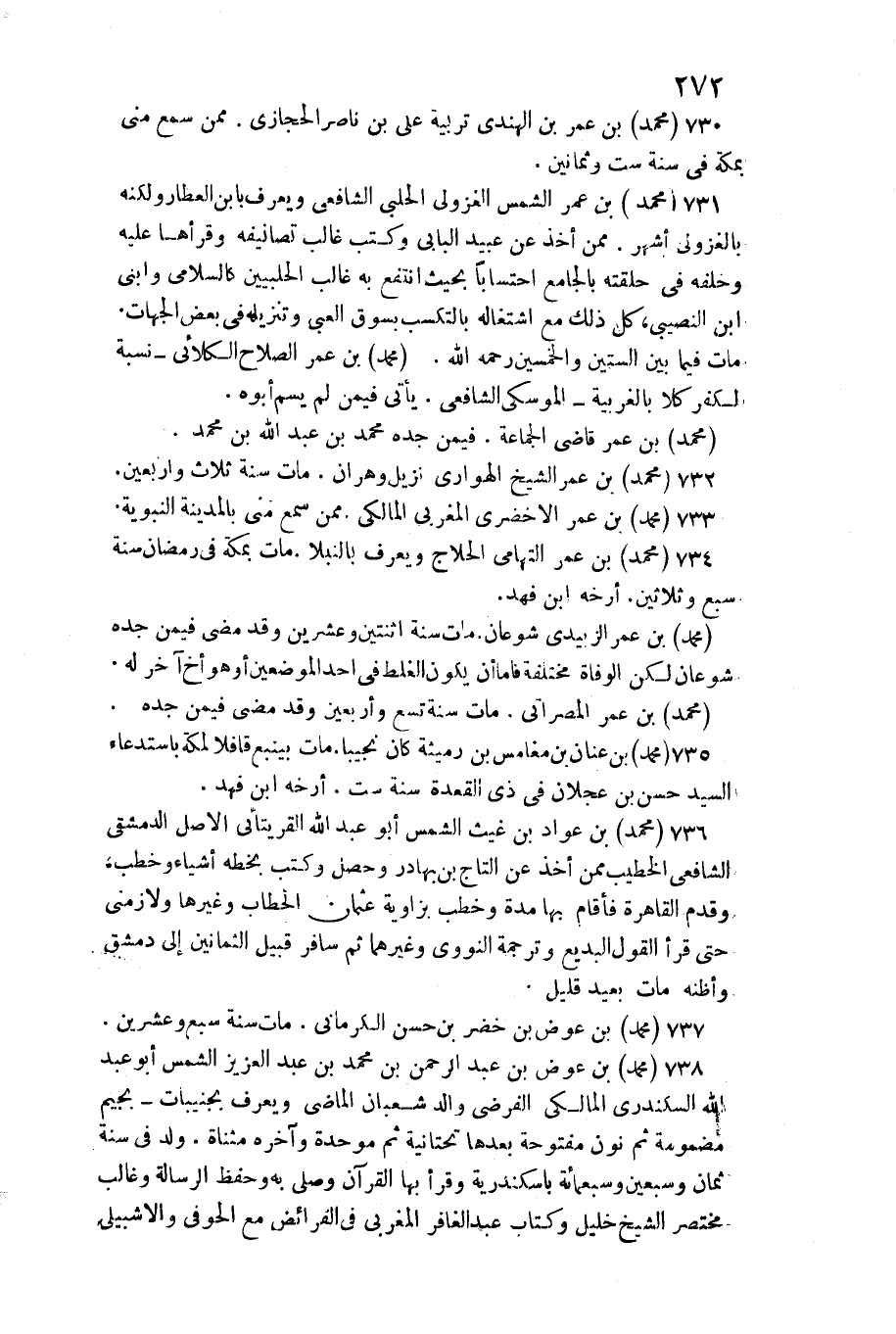 مُحَمَّد بن عمر المصراتي. مَاتَ سنة تسع وَأَرْبَعين وَقد مضى فِيمَن جده. مُحَمَّد بن عنان بن مغامس بن رميثة كَانَ نجيبا. مَاتَ بينبع قَافِلًا لمَكَّة باستدعاء السَّيِّد حسن بن عجلَان فِي ذِي الْقعدَة سنة سِتّ. أرخه ابْن فَهد. مُحَمَّد بن عواد بن غيث الشَّمْس أَبُو عبد الله القريتائي الأَصْل الدِّمَشْقِي الشَّافِعِي الْخَطِيب مِمَّن أَخذ عَن التَّاج بن بهادر وَحصل وَكتب بِخَطِّهِ أَشْيَاء وخطب، وَقدم الْقَاهِرَة فَأَقَامَ بهَا مُدَّة وخطب بزاوية عُثْمَان الْحطاب وَغَيرهَا ولازمني حَتَّى قَرَأَ القَوْل البديع وترجمة النَّوَوِيّ وَغَيرهمَا ثمَّ سَافر قبيل الثَّمَانِينَ إِلَى دمشق وَأَظنهُ مَاتَ بعيد قَلِيل. مُحَمَّد بن عوض بن خضر بن حسن الْكرْمَانِي. مَاتَ سنة سبع وَعشْرين. مُحَمَّد بن عوض بن عبد الرَّحْمَن بن مُحَمَّد بن عبد الْعَزِيز الشَّمْس أَبُو عبد الله السكندري الْمَالِكِي الفرضي وَالِد شعْبَان الْمَاضِي وَيعرف بجنيبات بجيم مَضْمُومَة ثمَّ نون مَفْتُوحَة بعْدهَا تَحْتَانِيَّة ثمَّ مُوَحدَة وَآخره مثناة. ولد فِي سنة ثَمَان وَسبعين وَسَبْعمائة باسكندرية وَقَرَأَ بهَا الْقُرْآن وَصلى بِهِ وَحفظ الرسَالَة وغالب مُخْتَصر الشَّيْخ خَلِيل وَكتاب)