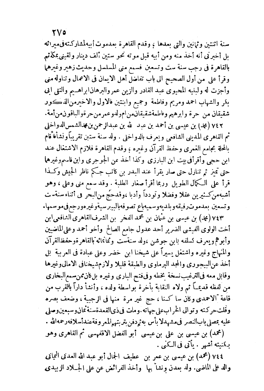 سنة اثْنَتَيْنِ وَثَمَانِينَ وَالَّتِي بعْدهَا وَقدم الْقَاهِرَة بعد موت أَبِيه لمشاركته فِي مِيرَاثه بل أَخْبرنِي أَنه أَخذ مِنْهُ وَمن أَبِيه قبل مَوته نَحْو سِتِّينَ ألف دِينَار ولقيتي يمكة ثمَّ بِالْقَاهِرَةِ فِي رَجَب سنة سِتّ وَتِسْعين فَسمع مني المسلسل وَحَدِيث زُهَيْر وَغَيرهمَا وَقَرَأَ على من أول الصَّحِيح إِلَى بَاب تفاضل أهل الْإِيمَان فِي الْأَعْمَال وتناوله مني وأجزت لَهُ ولبنيه المحيوي عبد الْقَادِر والزين عمر والبرهان إِبْرَاهِيم والتقي أبي بكر والشهاب أَحْمد وَمَرْيَم وَفَاطِمَة وَجَمِيع وابنتين فَالْأول والأخير من الذُّكُور شقيقان من حرَّة وَإِبْرَاهِيم وَفَاطِمَة شقيقان من أم ولد وَعمر من حرَّة وَالْبَاقُونَ من أمة. مُحَمَّد بن عِيسَى بن أَحْمد بن عبد الله بن عبد الرَّحْمَن بن مُحَمَّد الشَّمْس الدواخلي ثمَّ القاهري الْمَدِينِيّ الشَّافِعِي وَيعرف بالدواخلي. ولد سنة سِتِّينَ تَقْرِيبًا وَنَشَأ فَأَقَامَ بالمحلة بِجَامِع الغمري وَحفظ الْقُرْآن وَغَيره وَقدم الْقَاهِرَة فلازم الِاشْتِغَال عِنْد ابْن حجي وأقرأ فِي بَيت ابْن الْبَارِزِيّ وَكَذَا أَخذ عَن الْجَوْجَرِيّ وَابْن قَاسم وَغَيرهمَا حَتَّى تميز ثمَّ تنازل حَتَّى صَار يقْرَأ عِنْد الْبَدْر بن كَاتب جكم نَاظر الْجَيْش وَكَذَا قَرَأَ على الْكَمَال الطَّوِيل وَرُبمَا أَقرَأ صغَار الطّلبَة. وَقد سمع مني وَعلي، وَهُوَ أشبه من كثيرين عقلا وفضلا وتوددا وأدبا، وَقد حج من الْبَحْر فِي أثْنَاء سنة سِتّ وَتِسْعين بعد موت رَفِيقه وبلديه وسميه بَاعَ تصوفه بالبيبرسية وَغَيره وَرجع فِي موسمها. مُحَمَّد بن عِيسَى بن عُثْمَان بن مُحَمَّد الْفَخر بن الشّرف القاهري الشَّافِعِي ابْن أُخْت الولوي الفيشي الضَّرِير أحد عدُول جَامع الصَّالح وأخو أَحْمد وَعلي الماضيين وأبوهم وَيعرف كسلفه بِابْن جوشن، ولد سنة سِتّ وَثَمَانمِائَة بِالْقَاهِرَةِ وَحفظ الْقُرْآن والمنهاج وَغَيره واشتغل يَسِيرا على شَيخنَا ابْن خضر وعَلى عبَادَة فِي الْعَرَبيَّة بل أَخذ عَن البيجوري وَالْمجد الْبرمَاوِيّ والطبقة قَلِيلا ولازم شَيخنَا فِي الأمالي وَغَيرهَا وقابل مَعَه فِي التَّرْغِيب نُسْخَة بِخَطِّهِ وَفِي فتح الْبَارِي وَغَيره بل كَانَ مِمَّن سمع البُخَارِيّ من لَفظه قَدِيما ثمَّ ولاه النقابة بِأخرَة بواسط وَلَده، وَأَنْشَأَ دَارا بِالْقربِ من قاعة الأحمدي وَكَانَ سَاكِنا، حج غير مرّة مِنْهَا فِي الرجبية، وَضعف بَصَره وَقلت حركته وتوالى الخراب على جهاته. وَمَات ف ذِي الْقعدَة)