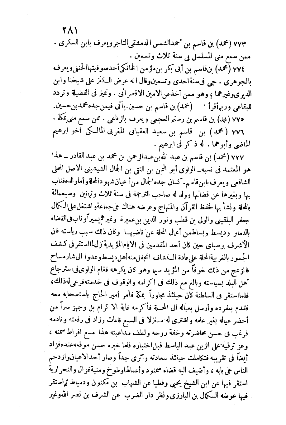 مُحَمَّد بن قَاسم بن أَحْمد الشَّمْس الدِّمَشْقِي التَّاجِر وَيعرف بِابْن السكرِي. مِمَّن سمع مني المسلسل فِي سنة ثَلَاث وَتِسْعين. مُحَمَّد بن قَاسم بن أبي بكر بن مُؤمن الخانكي أحد صوفيتها الْحَنَفِيّ وَيعرف بالجوهري. جي فِي سنة إِحْدَى وَتِسْعين وَقَالَ إِنَّه عرض الْكَنْز على شَيخنَا وَابْن الديري وَغَيرهمَا وَهُوَ مِمَّن أَخذ عَن الْأمين الأقصرائي. وتميز فِي الْفَضِيلَة وَتردد للبقاعي وَرُبمَا أَقرَأ. مُحَمَّد بن قَاسم بن حُسَيْن. يَأْتِي فِيمَن جده مُحَمَّد بن حُسَيْن.) ::: مُحَمَّد بن قَاسم بن رستم العجمي وَيعرف بالرفاعي. مِمَّن سمع مني بِمَكَّة. مُحَمَّد بن قَاسم بن سعيد العقباني المغربي الْمَالِكِي أَخُو إِبْرَاهِيم الْمَاضِي وأبوهما. لَهُ ذكر فِي إِبْرَهِيمُ. مُحَمَّد بن قَاسم بن عبد الله بن عبد الرَّحْمَن بن مُحَمَّد بن عبد الْقَادِر هَذَا هُوَ الْمُعْتَمد فِي نسبه الولوي أَبُو الْيمن بن التقي بن الْجمال الشيشيني الأَصْل الْمحلي الشَّافِعِي وَيعرف بِابْن قَاسم. كَانَ جده الْجمال من أَعْيَان شُهُود الْمحلة وَأما وَالِده فناب بهَا وبغيرها عَن قضاتها وَولد لَهُ صَاحب التَّرْجَمَة فِي سنة ثَلَاث وَثَمَانِينَ وَسَبْعمائة بالمحلة وَنَشَأ بهَا فحفظ الْقُرْآن والمنهاج وَعرضه هُنَاكَ على جمَاعَة واشتغل على الْكَمَال جَعْفَر البُلْقِينِيّ وَالْوَلِيّ بن قطب وَنور الدّين بن عميرَة وَغَيرهم يَسِيرا وناب فِي الْقَضَاء بالدماتر وديسط وبساط من أَعمال الْمحلة عَن قاضيها وَكَانَ ذَلِك سَبَب رياسته فَإِن الْأَشْرَف برسباي حِين كَانَ أحد المقدمين فِي الْأَيَّام المؤيدية نزل لما اسْتَقر فِي كشف الجسور بالغربية الْمحلة على عَادَة الْكَشَّاف انجفل مِنْهُ أهل ديسط وعدوا إِلَى شارمساح فانزعج من ذَلِك خوفًا من الْمُؤَيد سِيمَا وَهُوَ كَانَ يكرههُ فَقَامَ الولوي فِي استرجاع أهل الْبَلَد بسياسته وَبَالغ مَعَ ذَلِك فِي إكرامه وَالْوُقُوف فِي خدمته فرعى لَهُ ذَلِك، فَلَمَّا اسْتَقر فِي السلطنة كَانَ حِينَئِذٍ مجاورا بِمَكَّة فَأمر أَمِير الْحَاج باستصحابه مَعَه فَقدم بمفرده وَأرْسل بعياله إِلَى الْمحلة فَأكْرمه غَايَة الْإِكْرَام بل وجهز سرا من أحضر عِيَاله بِغَيْر علمه اشْترى لَهُ منزلا فِي السَّبع قاعات وَزَاد فِي رفعته ونادمه فَرغب فِي حسن محاضرته وخفة روحه ولطف مداعبته هَذَا مَعَ إفراط سمنه، وَعز ترقيه على الزين عبد الباسط قبل اختباره فَلَمَّا خَبره حسن موقعه عِنْده فَزَاد أَيْضا فِي تقريبه فتكاملت حِينَئِذٍ سعادته وأثرى جدا وَصَارَ أحد الْأَعْيَان وازدحم النَّاس على بَابه، وأضيف إِلَيْهِ قَضَاء سمنود وأعمالها وطوخ ومنية غزال والنحرارية اسْتَقر فِيهَا عَن ابْن الشَّيْخ يحيى وقطيا عَن الشهَاب بن مَكْنُون ودمياط ثمَّ اسْتَقر فِيهَا عوضه الْكَمَال بن الْبَارِزِيّ وَنظر دَار الضَّرْب عَن الشّرف بن نصر الله وَغير