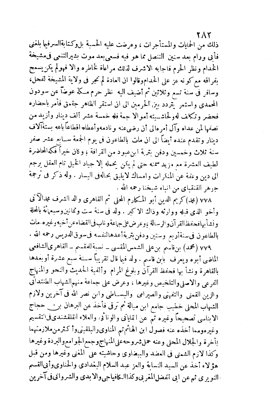 لفحل، وسافر فِي سنة تسع وَثَلَاثِينَ ثمَّ أضيف إِلَيْهِ نظر حرم مَكَّة عوضا عَن سودون المحمدي وَاسْتمرّ يتَرَدَّد بَين الْحَرَمَيْنِ إِلَى أَن اسْتَقر الظَّاهِر جقمق فَأمر بإحضاره فَحَضَرَ وتكلف لَهُ ولحاشيته أَمْوَالًا جمة فَلهُ خَمْسَة عشر ألف دِينَار وأزيد من نصفهَا لمن عداهُ وَآل أمره إِلَى أَن رَضِي عَنهُ ونادمه وَأَعْطَاهُ إقطاعا بَاعه بِسِتَّة آلَاف دِينَار وَتقدم عِنْده أَيْضا إِلَى أَن مَاتَ بالطاعون فِي يَوْم الْجُمُعَة سَابِع عشر صفر سنة ثَلَاث وَخمسين وَدفن بتربة ابْن عبود من القرافة وَكَانَ خيرا فكه المحاضرة لطيف الْعشْرَة مَعَ مزِيد سمنه حَتَّى لم يكن يحملهُ إِلَّا جِيَاد الْخَيل تَامّ الْعقل يرجع إِلَى دين وعفة عَن الْمُنْكَرَات وإمساك لَا يَلِيق بِحَالهِ فِي الْيَسَار. وَله ذكر فِي تَرْجَمَة جَوْهَر القنقباي من إنباء شَيخنَا رَحمَه الله. مُحَمَّد كريم الدّين أَبُو الكارم الْمحلى ثمَّ القاهري وَالِد الشّرف مُحَمَّد الْآتِي وأخو الَّذِي قبله ووارثه وَذَاكَ الْأَكْبَر. ولد فِي سنة سِتّ وَثَمَانِينَ وَسَبْعمائة بالمحلة وَنَشَأ بهَا فحفظ الْقُرْآن والرسالة وَعرض على جمَاعَة وناب فِي الْقَضَاء عَن أَخِيه غَيره. مَاتَ بالطاعون فِي سنة أَربع وَسِتِّينَ وَدفن بتربة أعدهَا لنَفسِهِ فِي سوق الدريس رَحمَه الله. مُحَمَّد بن قَاسم بن عَليّ الشَّمْس المقسي نِسْبَة للمقسم القاهري الشَّافِعِي الْمَاضِي أَبوهُ وَيعرف بِابْن قَاسم. ولد فِيمَا قَالَ تَقْرِيبًا سنة سبع عشرَة أَو بعْدهَا بِالْقَاهِرَةِ وَنَشَأ بهَا فحفظ الْقُرْآن وبلوغ المرام وألفية الحَدِيث والنحو والمنهاج الفرعي والأصلي وَالتَّلْخِيص وَغَيرهَا، وَعرض على جمَاعَة مِنْهُم الشهَاب الطنتدائي والزين القمني والتفهني والصيرامي والبساطي وَابْن نصر الله فِي آخَرين ولازم الشهَاب الْمحلي خطيب جَامع ابْن ميالة ثمَّ ترقى فَأخذ عَن الْبُرْهَان بن حجاج الإبناسي تَصْحِيحا وَغَيره ثمَّ عَن القاياتي والونائي والْعَلَاء القلقشندي فِي التَّقْسِيم وَغَيره وَمِمَّا أَخذه عَنهُ فُصُول ابْن الهائم ثمَّ الْمَنَاوِيّ والبلقيني وَأكْثر من ملازمتهما بِأخرَة والجلال الْمحلي وَعنهُ حمل شروحه على الْمِنْهَاج وَجمع الْجَوَامِع والبردة وَغَيرهَا وَكَذَا لَازم الشمني فِي الْعَضُد والبيضاوي وحاشيته على الْمُغنِي وَغَيرهَا وَمن قبل هَؤُلَاءِ أَخذ عَن السَّيِّد النسابة والعز عبد السَّلَام الْبَغْدَادِيّ والحناوي وَأبي الْقسم النويري ثمَّ عَن أبي الْفضل المغربي وَكَذَا الكافياجي والأبدي والشرواني فِي آخَرين