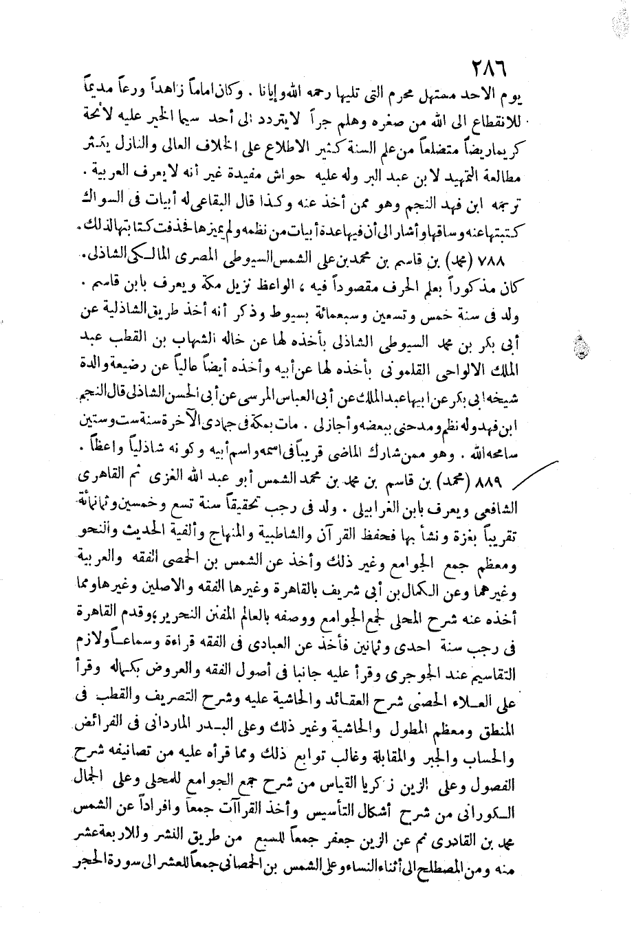 يَوْم الْأَحَد مستهل محرم الَّتِي تَلِيهَا رَحمَه الله وإيانا. وَكَانَ إِمَامًا زاهدا ورعا مديما للانقطاع إِلَى الله من صغره وهلم جرا لَا يتَرَدَّد إِلَى أحد سِيمَا الْخَيْر عَلَيْهِ لائحة كَرِيمًا ريضا متضلعا من علم السّنة كثير الِاطِّلَاع على الْخلاف العالي والنازل يكثر مطالعة التَّمْهِيد لِابْنِ عبد الْبر وَله عَلَيْهِ حواش مفيدة غير أَنه لَا يعرف الْعَرَبيَّة. تَرْجَمَة ابْن فَهد النَّجْم وَهُوَ مِمَّن أَخذ عَنهُ وَكَذَا قَالَ البقاعي لَهُ أَبْيَات فِي السِّوَاك كتبتها عَنهُ وساقها وَأَشَارَ إِلَى أَن فِيهَا عدَّة أَبْيَات من نظمه وَلم يميزها فحذفت كتَابَتهَا لذَلِك. مُحَمَّد بن قَاسم بن مُحَمَّد بن عَليّ الشَّمْس السُّيُوطِيّ الْمصْرِيّ الْمَالِكِي الشاذلي. كَانَ مَذْكُورا بِعلم الْحَرْف مَقْصُودا فِيهِ، الْوَاعِظ نزيل مَكَّة وَيعرف بِابْن قَاسم. ولد فِي سنة خمس وَتِسْعين وَسَبْعمائة بسيوط وَذكر أَنه أَخذ طَرِيق الشاذلية عَن أبي بكر بن مُحَمَّد السُّيُوطِيّ الشاذلي بِأَخْذِهِ لَهَا عَن خَاله الشهَاب بن القطب عبد الْملك الألواحي القلموني بِأَخْذِهِ لَهَا عَن أَبِيه وَأَخذه أَيْضا عَالِيا عَن رضيعة وَالِدَة شَيْخه أبي بكر عَن أَبِيهَا عبد الْملك عَن أبي الْعَبَّاس المرسي عَن أبي الْحسن الشاذلي قَالَ النَّجْم ابْن فَهد وَله نظم ومدحني بِبَعْضِه وَأَجَازَ لي.