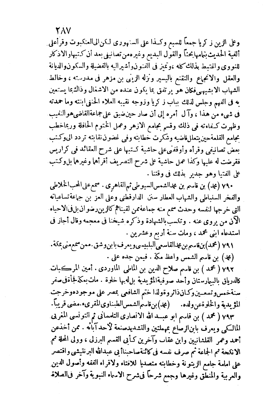 وعَلى الزين زَكَرِيَّا جمعا للسبع وَكَذَا على السنهوري لَكِن إِلَى العنكبوت وَقَرَأَ على ألفية الحَدِيث بِتَمَامِهَا بحثا وَالْقَوْل البديع وَغَيره من تصانيفي بعد أَن كتبهَا والأذكار للنووي واغتبط بذلك كُله، وتميز فِي الْفُنُون وأشير إِلَيْهِ بالفضيلة والسكون والديانة الْعقل والانجماع والتقنع باليسير ونزله الزيني بن مزهر فِي مدرسته، وخالط الشهَاب الأبشيهي فَكَانَ هُوَ يرتفق بِمَا يكون عِنْده من الأشغال وَذَاكَ بِمَا يَسْتَعِين بِهِ فِي الْفَهم وَجلسَ لذَلِك بِبَاب زَكَرِيَّا وزوجه نقيبه الْعَلَاء الْحَنَفِيّ ابْنَته وَمَا حمدته فِي شَيْء من هَذَا، وَآل أمره إِلَى أَن صَار حِين ضيق على جمَاعَة القَاضِي هُوَ النَّقِيب وَظَهَرت كفاءته فِي ذَلِك وَقسم بِجَامِع الْأَزْهَر وَعمل الختوم الحافلة وَرُبمَا خطب بِجَامِع القلعة حِين يتعلل قاضيه وشكرت خطابته وَفِي غُضُون نقابته تردد إِلَيّ وَكتب بعض تصانيفي وقرأه وأوقفني على حَاشِيَة كتبهَا على شرح العقائد فِي كراريس فقرضت لَهُ عَلَيْهَا وَكَذَا عمل حَاشِيَة على شرح التصريف أقرأهما وَغَيرهمَا بل وَكتب على الْفتيا وَهُوَ جدير بذلك فِي وقتنا. مُحَمَّد بن قَاسم بن مُحَمَّد الشَّمْس السُّيُوطِيّ ثمَّ القاهري. سمع على الْمُحب الخلاطي وَالْفَخْر السنباطي والشهاب الْعَطَّار سنَن الدَّارَقُطْنِيّ وعَلى الْعِزّ بن جمَاعَة تساعياته الَّتِي خرجها لنَفسِهِ وَحدث سمع مِنْهُ جمَاعَة مِمَّن لَقِينَاهُمْ كالزين رضوَان بل فِي الْأَحْيَاء الْآن من يروي عَنهُ. وتكسب بِالشَّهَادَةِ وَذكره شَيخنَا فِي مُعْجَمه وَقَالَ أجَاز فِي استدعاء ابْني مُحَمَّد، وَمَات سنة أَربع وَعشْرين. مُحَمَّد بن قَاسم بن مُحَمَّد القاسمي البلبيسي وَيعرف بِابْن وشق. مِمَّن سمع مني بِمَكَّة.