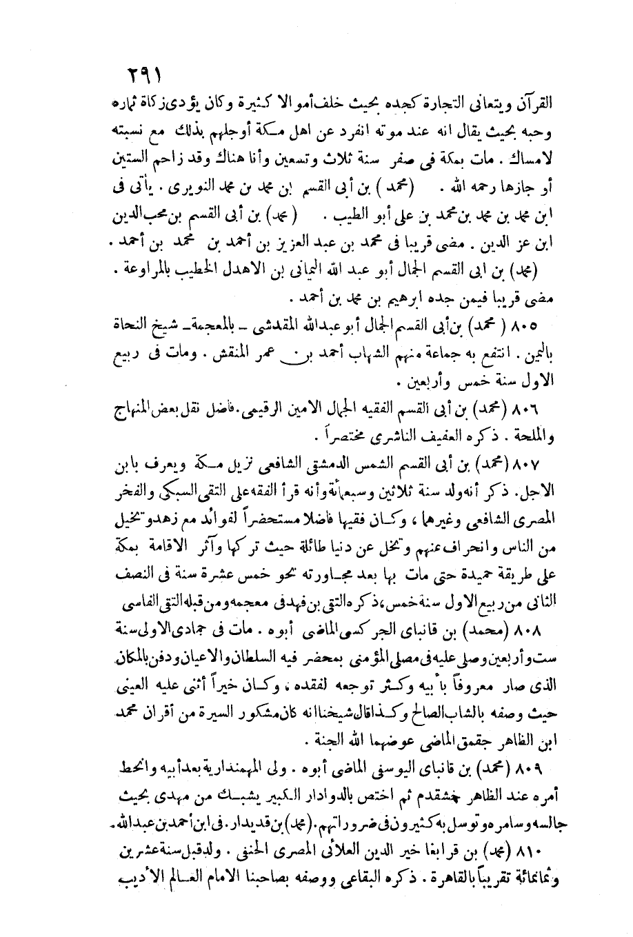 الْقُرْآن ويتعانى التِّجَارَة كجده بِحَيْثُ خلف أَمْوَالًا كَثِيرَة وَكَانَ يُؤَدِّي زَكَاة ثماره وحبه بِحَيْثُ يُقَال إِنَّه عِنْد مَوته انْفَرد عَن أهل مَكَّة أوجلهم بذلك مَعَ نسبته لإمساك. مَاتَ بِمَكَّة فِي صفر سنة ثَلَاث وَتِسْعين وَأَنا هُنَاكَ وَقد زاحم السِّتين أَو جازها رَحمَه الله. مُحَمَّد بن أبي الْقسم بن مُحَمَّد بن مُحَمَّد النويري. يَأْتِي فِي ابْن مُحَمَّد بن مُحَمَّد بن مُحَمَّد بن عَليّ أَبُو الطّيب. مُحَمَّد بن أبي الْقسم بن محب الدّين بن عز الدّين. مضى قَرِيبا فِي مُحَمَّد بن عبد الْعَزِيز بن أَحْمد بن مُحَمَّد بن أَحْمد.