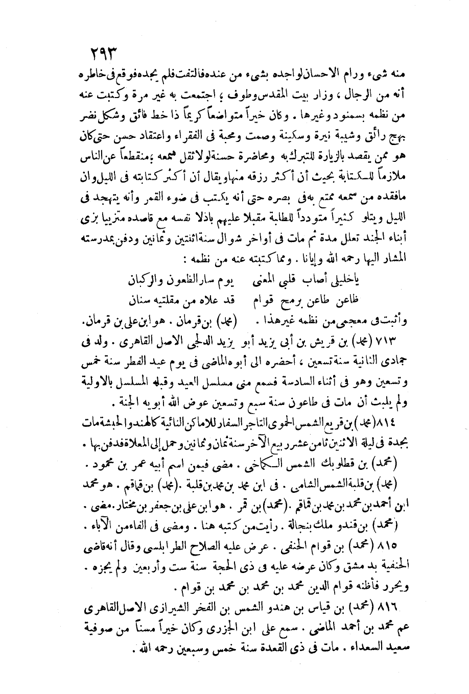 وَأثبت فِي معجمي من نظمه غير هَذَا. مُحَمَّد بن قرمان. هُوَ ابْن عَليّ بن قرمان. مُحَمَّد بن قُرَيْش بن أبي يزِيد أَبُو يزِيد الدلجي الأَصْل القاهري. ولد فِي جُمَادَى الثَّانِيَة سنة تسعين، أحضرهُ إِلَى أَبوهُ الْمَاضِي فِي يَوْم عيد الْفطر سنة خمس وَتِسْعين وَهُوَ فِي أثْنَاء السَّادِسَة فَسمع مني مسلسل الْعِيد وَقَبله المسلسل بالأولية وَلم يلبث أَن مَاتَ فِي طاعون سنة سبع وَتِسْعين عوض الله أَبَوَيْهِ الْجنَّة. مُحَمَّد بن قريع الشَّمْس الْحَمَوِيّ التَّاجِر السفار للأماكن النائية كالهند والحبشة مَاتَ بجدة فِي لَيْلَة الِاثْنَيْنِ ثامن عشر ربيع الآخر سنة ثَمَان وَثَمَانِينَ وَحمل إِلَى المعلاة فَدفن بهَا.