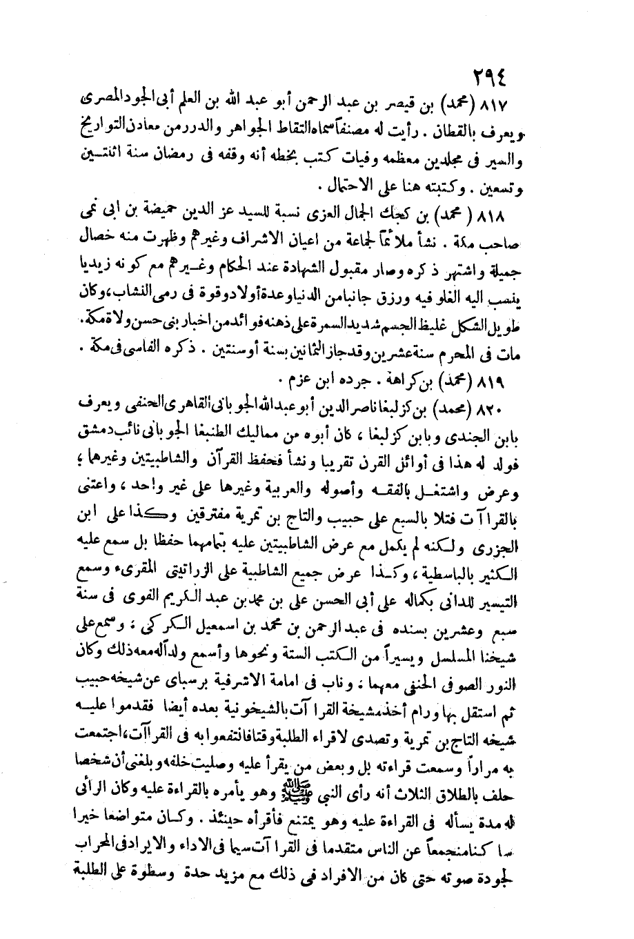 مجلدين معظمه وفيات كتب بِخَطِّهِ أَنه وَقفه فِي رَمَضَان سنة اثْنَتَيْنِ وَتِسْعين. وكتبته هُنَا على الِاحْتِمَال. مُحَمَّد بن كجك الْجمال الْعزي نِسْبَة للسَّيِّد عز الدّين حميضة بن أبي نمى صَاحب مَكَّة. نَشأ ملائما لجَماعَة من أَعْيَان الإشراف وَغَيرهم وَظَهَرت مِنْهُ خِصَال جميلَة واشتهر ذكره وَصَارَ مَقْبُول الشَّهَادَة عِنْد الْحُكَّام وَغَيرهم مَعَ كَونه زيديا ينْسب إِلَيْهِ الغلو فِيهِ ورزق جانبا من الدُّنْيَا وعدة أَوْلَاد وَقُوَّة فِي رمي النشاب، وَكَانَ طَوِيل الشكل غليظ الْجِسْم شَدِيد السمرَة على ذهنه فَوَائِد من أَخْبَار بني حسن وُلَاة مَكَّة مَاتَ فِي الْمحرم سنة عشْرين وَقد جَازَ الثَّمَانِينَ بِسنة أَو سنتَيْن. ذكره الفاسي فِي مَكَّة. مُحَمَّد بن كَرَاهَة. جرده ابْن عزم. مُحَمَّد بن كزلبغا نَاصِر الدّين أَبُو عبد الله الجوباني القاهري الْحَنَفِيّ وَيعرف بِابْن الجندي وبابن كزلبغا، كَانَ أَبوهُ من مماليك الطنبغا الجوباني نَائِب دمشق فولد لَهُ هَذَا فِي أَوَائِل الْقرن تَقْرِيبًا وَنَشَأ فحفظ الْقُرْآن والشاطبيتين وَغَيرهمَا وَعرض واشتغل بالفقه وأصوله والعربية وَغَيرهَا على غير وَاحِد، واعتنى بالقراآت فَتلا بالسبع على حبيب والتاج بن تمرية مفترقين وَكَذَا على ابْن الْجَزرِي وَلكنه لم يكمل مَعَ عرض الشاطبيتين عَلَيْهِ بتمامهما حفظا بل سمع عَلَيْهِ الْكثير بالباسطية، وَكَذَا عرض جَمِيع الشاطبية على الزراتيتي الْمُقْرِئ وَسمع التَّيْسِير للداني بِكَمَالِهِ على أبي الْحسن عَليّ بن مُحَمَّد بن عبد الْكَرِيم الفوى فِي سنة سبع وَعشْرين بِسَنَدِهِ فِي عبد الرَّحْمَن بن مُحَمَّد بن إِسْمَاعِيل الكركي، وَسمع على شَيخنَا المسلسل ويسيرا من الْكتب السِّتَّة وَنَحْوهَا وأسمع ولدا لَهُ مَعَه ذَلِك وَكَانَ النُّور الصُّوفِي الْحَنَفِيّ مَعَهُمَا، وناب فِي إِمَامَة الأشرفية برسباي عَن شَيْخه حبيب ثمَّ اسْتَقل بهَا ورام أَخذ مشيخة القراآت بالشيخونية بعده أَيْضا فقدموا عَلَيْهِ شَيْخه التَّاج بن تمرية وتصدى لإقراء الطّلبَة وقتا فانتفعوا بِهِ فِي القراآت، اجْتمعت بِهِ مرَارًا وَسمعت قِرَاءَته بل وَبَعض من يقْرَأ عَلَيْهِ وَصليت خَلفه وَبَلغنِي أَن شخصا حلف بِالطَّلَاق الثَّلَاث أَنه رأى النَّبِي صلى الله عَلَيْهِ وَسلم وَهُوَ يَأْمُرهُ بِالْقِرَاءَةِ عَلَيْهِ وَكَانَ الرَّائِي لَهُ مُدَّة يسْأَله فِي الْقِرَاءَة عَلَيْهِ وَهُوَ يمْتَنع فَأَقْرَأهُ حِينَئِذٍ. وَكَانَ متواضعا خيرا سَاكِنا منجمعا عَن النَّاس مُتَقَدما فِي القراآت سِيمَا فِي الْأَدَاء والإيراد فِي الْمِحْرَاب لجودة صَوته حَتَّى كَانَ من الْإِفْرَاد فِي ذَلِك مَعَ مزِيد حِدة)