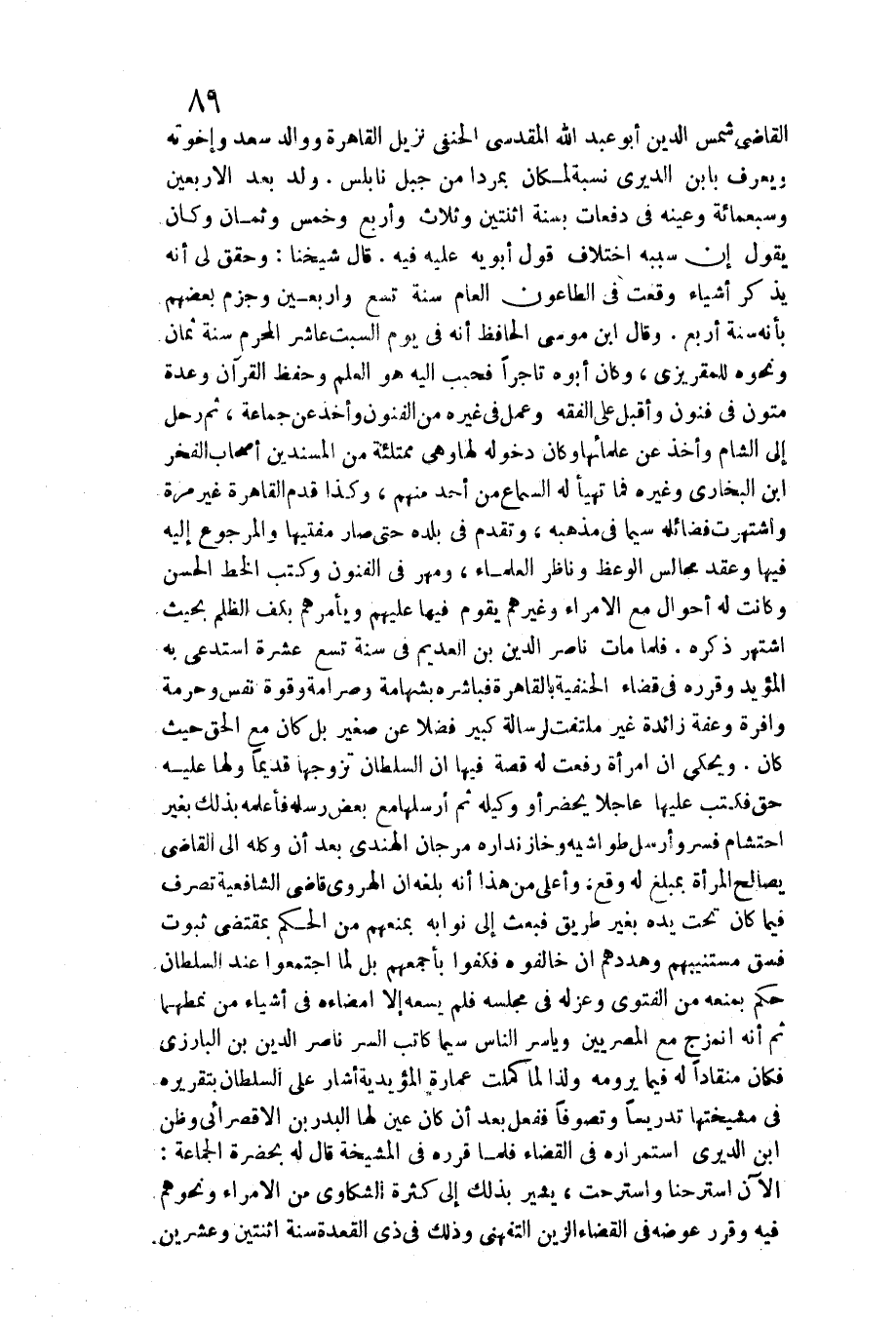 القَاضِي شمس الدّين أَبُو عبد الله الْمَقْدِسِي الْحَنَفِيّ نزيل الْقَاهِرَة ووالد سعد وَإِخْوَته وَيعرف بِابْن الديري نِسْبَة لمَكَان بمردا من جبل نابلس. ولد بعد الْأَرْبَعين وَسَبْعمائة وعينه فِي دفعات بِسنة اثْنَتَيْنِ وَثَلَاث وَأَرْبع وَخمْس وثمان وَكَانَ يَقُول إِن سَببه اخْتِلَاف قَول أَبَوَيْهِ عَلَيْهِ فِيهِ. قَالَ شَيخنَا: وحقق لي أَنه يذكر أَشْيَاء وَقعت فِي اللطاعون الْعَام سنة تسع وَأَرْبَعين وَجزم بَعضهم بِأَنَّهُ سنة أَربع. وَقَالَ ابْن مُوسَى الْحَافِظ أَنه فِي يَوْم السبت عَاشر الْمحرم سنة ثَمَان وَنَحْوه للمقريزي، وَكَانَ أَبوهُ تَاجِرًا فحبب إِلَيْهِ هُوَ الْعلم وَحفظ الْقُرْآن وعدة متون فِي فنون وَأَقْبل على الْفِقْه وَعمل فِي غَيره من الْفُنُون وَأخذ عَن جمَاعَة، ثمَّ رَحل إِلَى الشاعم وَأخذ عَن علمائها وَكَانَ دُخُوله لَهَا وَهِي ممتلئة من المسندين أَصْحَاب الْفَخر ابْن البُخَارِيّ وَغَيره فَمَا تهَيَّأ لَهُ السماع من أحد مِنْهُم، وَكَذَا قدم الْقَاهِرَة غير مرّة واشتهرت فضائله سِيمَا فِي مذْهبه، وَتقدم فِي بَلَده حَتَّى صَار مفتيها والمرجوع إِلَيْهَا فِيهَا وَعقد مجَالِس الْوَعْظ وناظر الْعلمَاء، وَمهر فِي الْفُنُون وَكتب الْخط الْحسن وَكَانَت لَهُ أَحْوَال مَعَ الْأُمَرَاء وَغَيرهم يقوم فِيهَا عَلَيْهِم وَيَأْمُرهُمْ بكف الظُّلم بِحَيْثُ اشْتهر ذكره. فَلَمَّا مَاتَ نَاصِر الدّين بن العديم فِي سنة تسع عشرَة استدعى بِهِ الْمُؤَيد وَقَررهُ فِي قَضَاء الْحَنَفِيَّة بِالْقَاهِرَةِ فباشره بشهامة وصرامة وَقُوَّة نفس وَحُرْمَة وافرة وعفة زَائِدَة غير ملتفت لرسالة كَبِير فضلا عَن صَغِير بل كَانَ مَعَ الْحق حَيْثُ كَانَ. ويحكى أَن امْرَأَة رفعت لَهُ قصَّة فِيهَا أَن السُّلْطَان تزَوجهَا قَدِيما وَلها عَلَيْهِ حق فَكتب عَلَيْهَا عَاجلا يحضر أَو وَكيله ثمَّ أرسلها مَعَ بعض رسله فَأعلمهُ بذلك بِغَيْر احتشام فسر وَأرْسل طواشيه وخازنداره مرجان الْهِنْدِيّ بعد أَن وَكله إِلَى القَاضِي يُصَالح الْمَرْأَة بمبلغ لَهُ وَقع، وَأَعْلَى من هَذَا أَنه بلغه أَن الْهَرَوِيّ قَاضِي الشَّافِعِيَّة تصرف فِيمَا كَانَت تَحت يَده بِغَيْر طَرِيق فَبعث إِلَى نوابه بمنعهم من الحكم بِمُقْتَضى ثُبُوت فسق مستنيبهم وهددهم إِن خالفوه فكفوا بأجمعهم بل لما اجْتَمعُوا عِنْد السُّلْطَان حكم بِمَنْعه من الْفَتْوَى وعزله فِي مَجْلِسه)