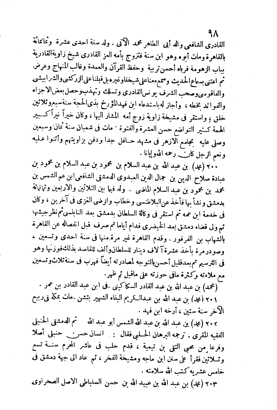 مُحَمَّد بن عبد الله بن عبد الْمُنعم الجرواني. فِي مُحَمَّد بن أَحْمد الجرواني. مُحَمَّد بن عبد الله بن عُثْمَان بن عَفَّان الشَّمْس الْحُسَيْنِي بَلَدا المقسي ثمَّ الموسكي الشَّافِعِي أَخُو الْفَقِيه عُثْمَان الْمَاضِي وأبوهما ووالد مُحَمَّد الْآتِي. ولد فِي ربيع الأول سنة خمس وَعشْرين وَثَمَانمِائَة بمنية فضَالة وتحول مَعَ أَبَوَيْهِ وأخيه إِلَى الْقَاهِرَة فسكنوا المقس وَقَرَأَ الْقُرْآن وجوده على الزين الهيثمي بل تلاه لأبي عَمْرو على عبد الْغَنِيّ الفارقاني وَقَرَأَ من الاهتمام تَلْخِيص الإِمَام إِلَى الْحَج وَكَذَا بعض مُخْتَصر التبريزي وَجمع ألفية النَّحْو وَبحث فِي التبريزي على الْمَنَاوِيّ بل حضر عِنْده عدَّة تقاسيم، وَكَذَا قَرَأَ فِي النَّحْو على الحناوي وَسمع على شَيخنَا وَغَيره وَجلسَ لإقراء الْأَطْفَال كأبيه وأخيه بزاوية بقنطرة الموسكي فنبغ من عِنْده جمَاعَة وأقرأ فِي بَيت أزبك الظَّاهِرِيّ وقطن تِلْكَ النَّاحِيَة وتكسب مَعَ ذَلِك بالخياطة على طَريقَة جميلَة من النصح وَالْوَفَاء وَحج وتنزل فِي صوفية سعيد السُّعَدَاء وَغَيرهَا بل خطب بأماكن كجاع عَمْرو نِيَابَة، ولمامات أَخُوهُ تكلم فِي تركته ثمَّ لم يلبث أَن مَاتَ وَلَده فورثه وتلقى عَنهُ وظائف مِنْهَا الْإِمَامَة بضريح الشَّافِعِي، وَهُوَ خير متودد سليم الْفطْرَة منجمع على شَأْنه. مُحَمَّد بن عبد الله بن عشائر. هُوَ ابْن عبد الله بن أَحْمد بن مُحَمَّد بن هَاشم بن عب الْوَاحِد. مضى. مُحَمَّد بن عبد الله بن عَليّ بن أَحْمد الشَّمْس الْقَرَافِيّ الشَّافِعِي الْوَاعِظ وَيعرف بالحفار وَهِي حِرْفَة أَبِيه. ولد فِي سنة خمس وَثَمَانِينَ وَسَبْعمائة بالقرافة وَنَشَأ بهَا فحفظ الْقُرْآن والعمدة والتنبيه والملحة، وَعرض على الأبناسي وَابْن الملقن والغماري وَعبد اللَّطِيف الأسنائي وَأَجَازَ لَهُ فِي آخَرين مِمَّن لم يجز كالصدر الْمَنَاوِيّ والتقي الزبيرِي، واشتغل يَسِيرا وتنزل فِي الْجِهَات وتعاني الْوَعْظ واشتهر شَأْنه فِيهِ وَصَارَ بِأخرَة شيخ الْجَمَاعَة مَعَ الدّين والتواضع والسكون وَحسن السمت