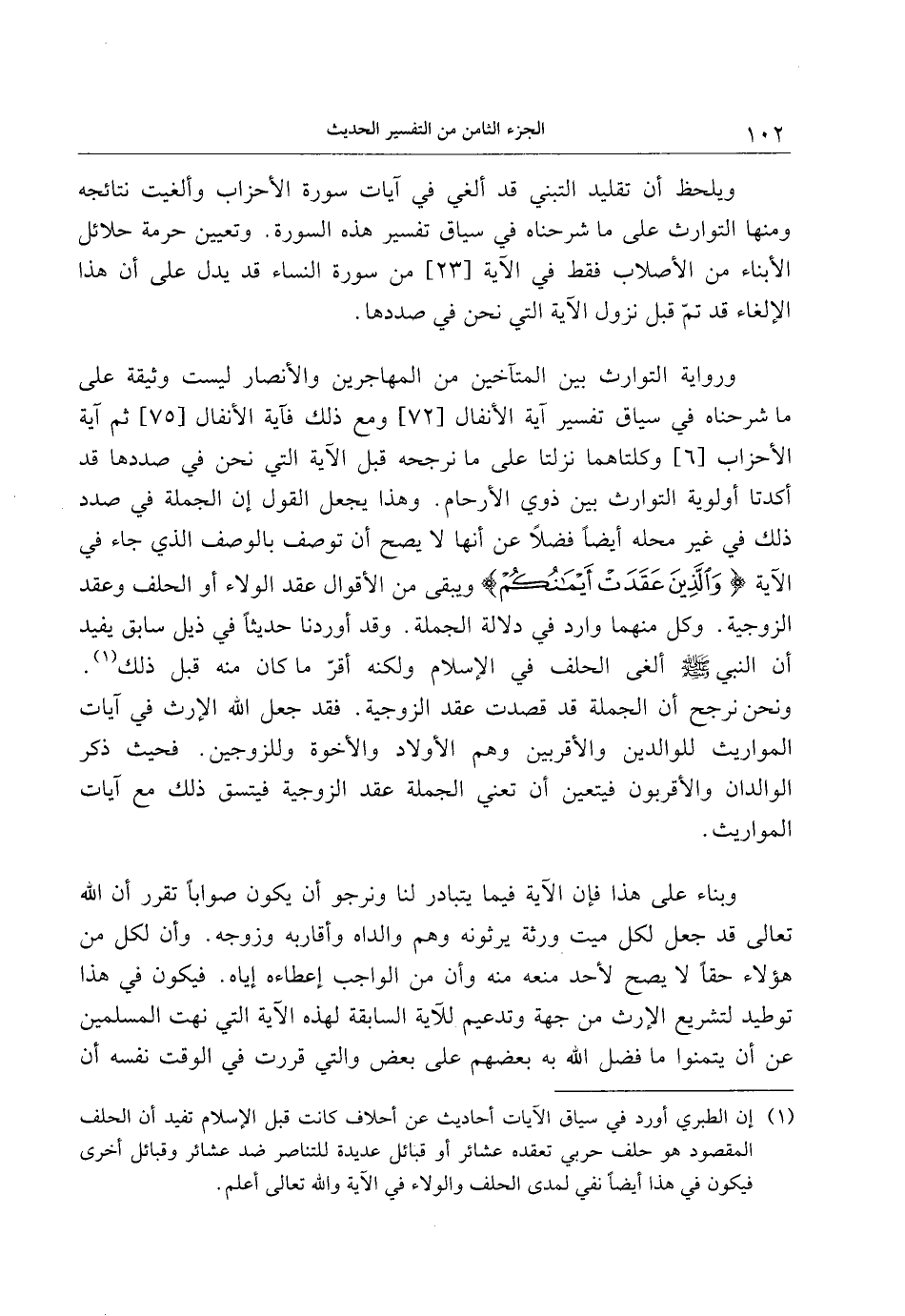 (1) إن الطبري أورد في سياق الآيات أحاديث عن أحلاف كانت قبل الإسلام تفيد أن الحلف المقصود هو حلف حربي تعقده عشائر أو قبائل عديدة للتناصر ضد عشائر وقبائل أخرى فيكون في هذا أيضا نفي لمدى الحلف والولاء في الآية والله تعالى أعلم.
