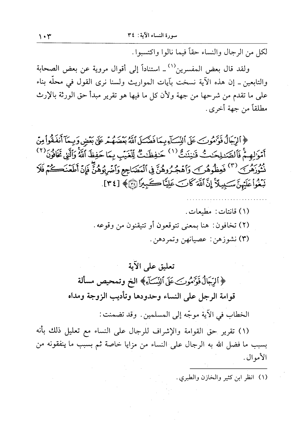 تعليق على الآية الرِّجالُ قَوَّامُونَ عَلَى النِّساءِ إلخ وتمحيص مسألة قوامة الرجل على النساء وحدودها وتأديب الزوجة ومداه