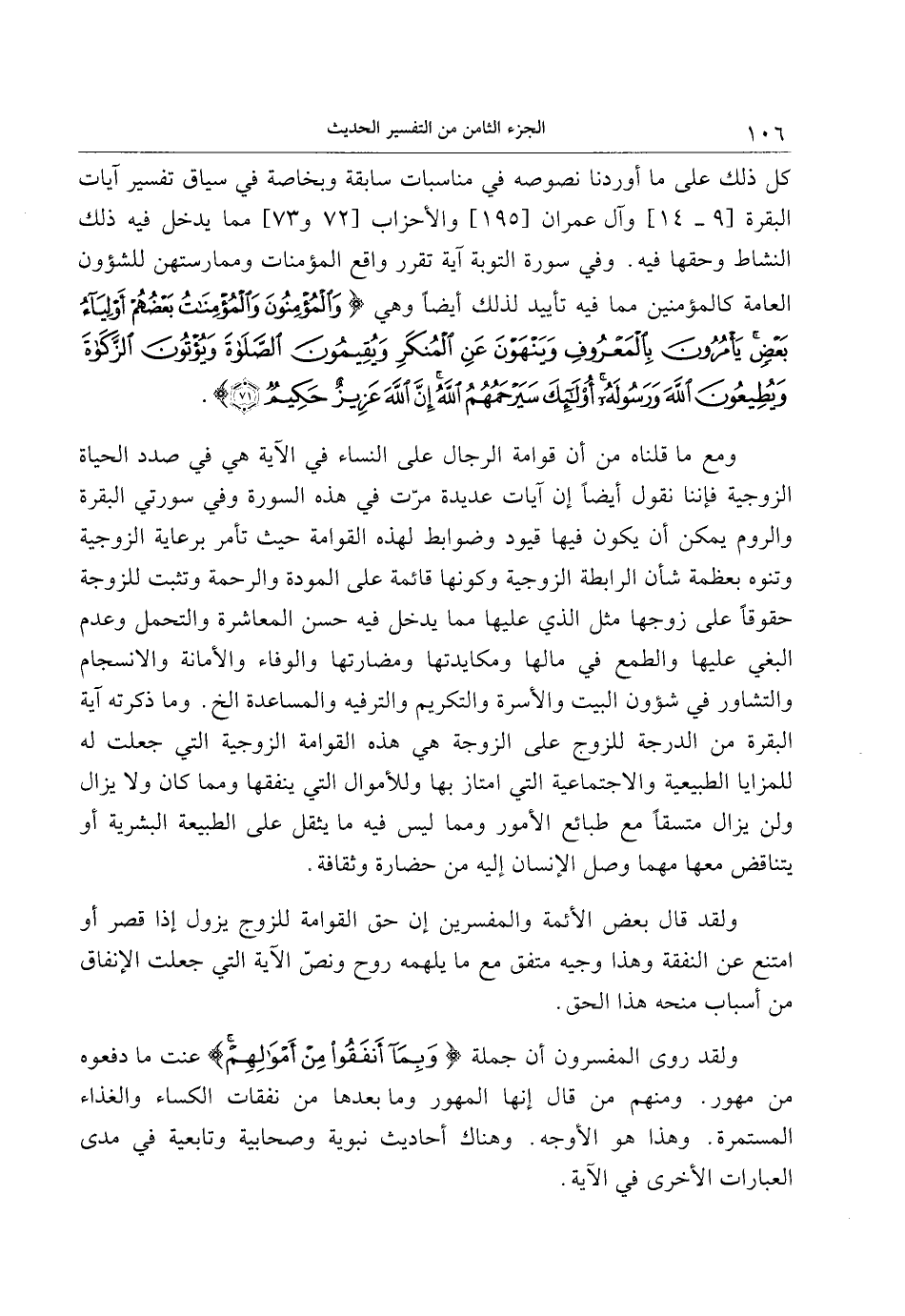 كل ذلك على ما أوردنا نصوصه في مناسبات سابقة وبخاصة في سياق تفسير آيات البقرة [9- 14] وآل عمران [195] والأحزاب [72 و 73] مما يدخل فيه ذلك النشاط وحقها فيه. وفي سورة التوبة آية تقرر واقع المؤمنات وممارستهن للشؤون العامة كالمؤمنين مما فيه تأييد لذلك أيضا وهي وَالْمُؤْمِنُونَ وَالْمُؤْمِناتُ بَعْضُهُمْ أَوْلِياءُ بَعْضٍ يَأْمُرُونَ بِالْمَعْرُوفِ وَيَنْهَوْنَ عَنِ الْمُنْكَرِ وَيُقِيمُونَ الصَّلاةَ وَيُؤْتُونَ الزَّكاةَ وَيُطِيعُونَ اللَّهَ وَرَسُولَهُ أُولئِكَ سَيَرْحَمُهُمُ اللَّهُ إِنَّ اللَّهَ عَزِيزٌ حَكِيمٌ (71) .