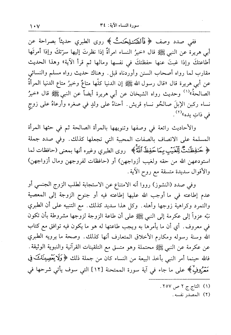 ففي صدد وصف فَالصَّالِحاتُ روى الطبري حديثا بصراحة عن أبي هريرة عن النبي صلى الله عليه وسلم قال «خير النساء امرأة إذا نظرت إليها سرّتك وإذا أمرتها أطاعتك وإذا غبت عنها حفظتك في نفسها ومالها ثم قرأ الآية» وهذا الحديث مقارب لما رواه أصحاب السنن وأوردناه قبل. وهناك حديث رواه مسلم والنسائي عن أبي هريرة قال «قال رسول الله صلى الله عليه وسلم إن الدنيا كلّها متاع وخير متاع الدنيا المرأة الصالحة» «1» وحديث رواه الشيخان عن أبي هريرة أيضا عن النبي صلى الله عليه وسلم قال «خير نساء ركبن الإبل صالحو نساء قريش. أحناه على ولد في صغره وأرعاه على زوج في ذات يده» «2» .