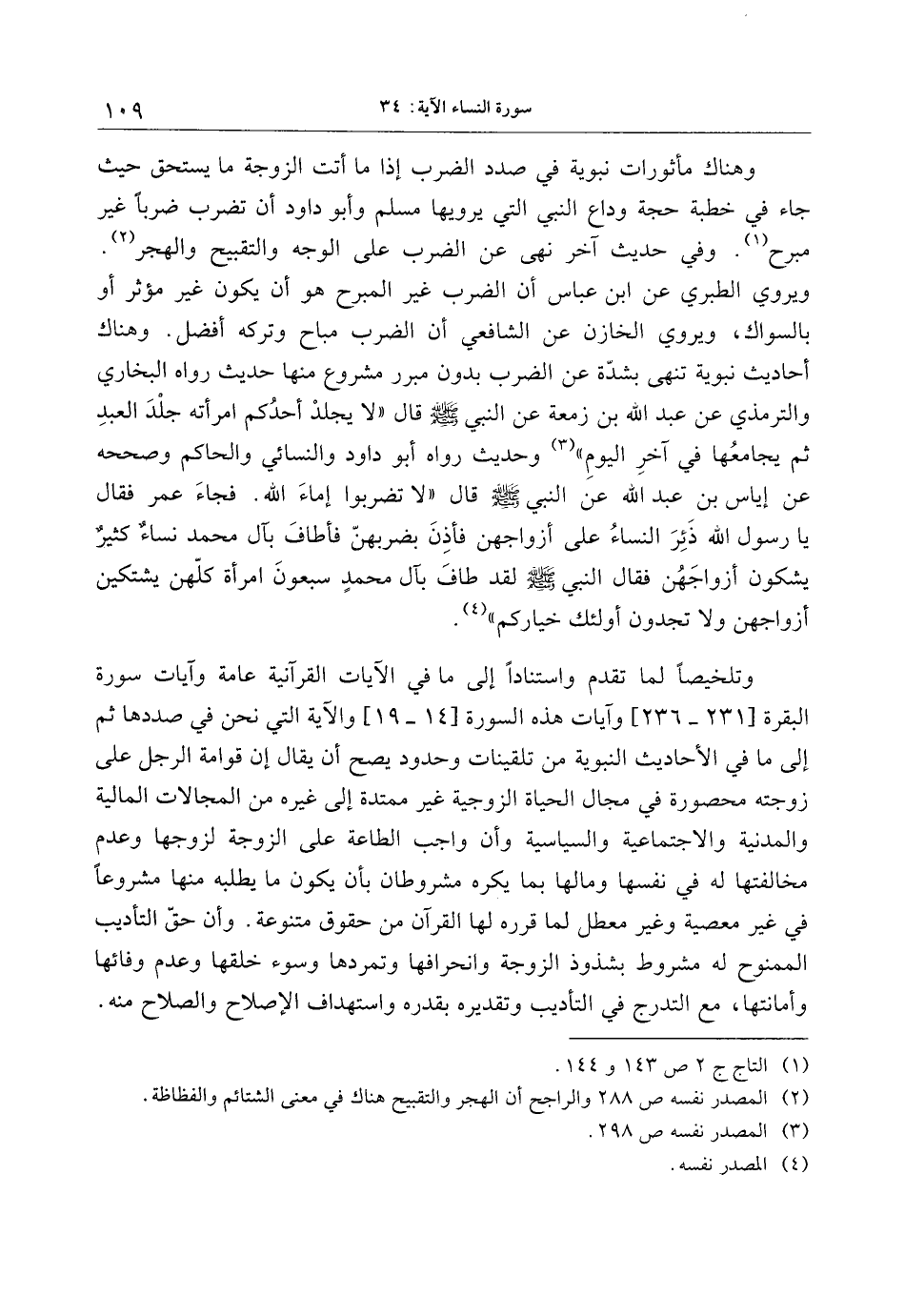 وتلخيصا لما تقدم واستنادا إلى ما في الآيات القرآنية عامة وآيات سورة البقرة [231- 236] وآيات هذه السورة [14- 19] والآية التي نحن في صددها ثم إلى ما في الأحاديث النبوية من تلقينات وحدود يصح أن يقال إن قوامة الرجل على زوجته محصورة في مجال الحياة الزوجية غير ممتدة إلى غيره من المجالات المالية والمدنية والاجتماعية والسياسية وأن واجب الطاعة على الزوجة لزوجها وعدم مخالفتها له في نفسها ومالها بما يكره مشروطان بأن يكون ما يطلبه منها مشروعا في غير معصية وغير معطل لما قرره لها القرآن من حقوق متنوعة. وأن حقّ التأديب الممنوح له مشروط بشذوذ الزوجة وانحرافها وتمردها وسوء خلقها وعدم وفائها وأمانتها، مع التدرج في التأديب وتقديره بقدره واستهداف الإصلاح والصلاح منه.