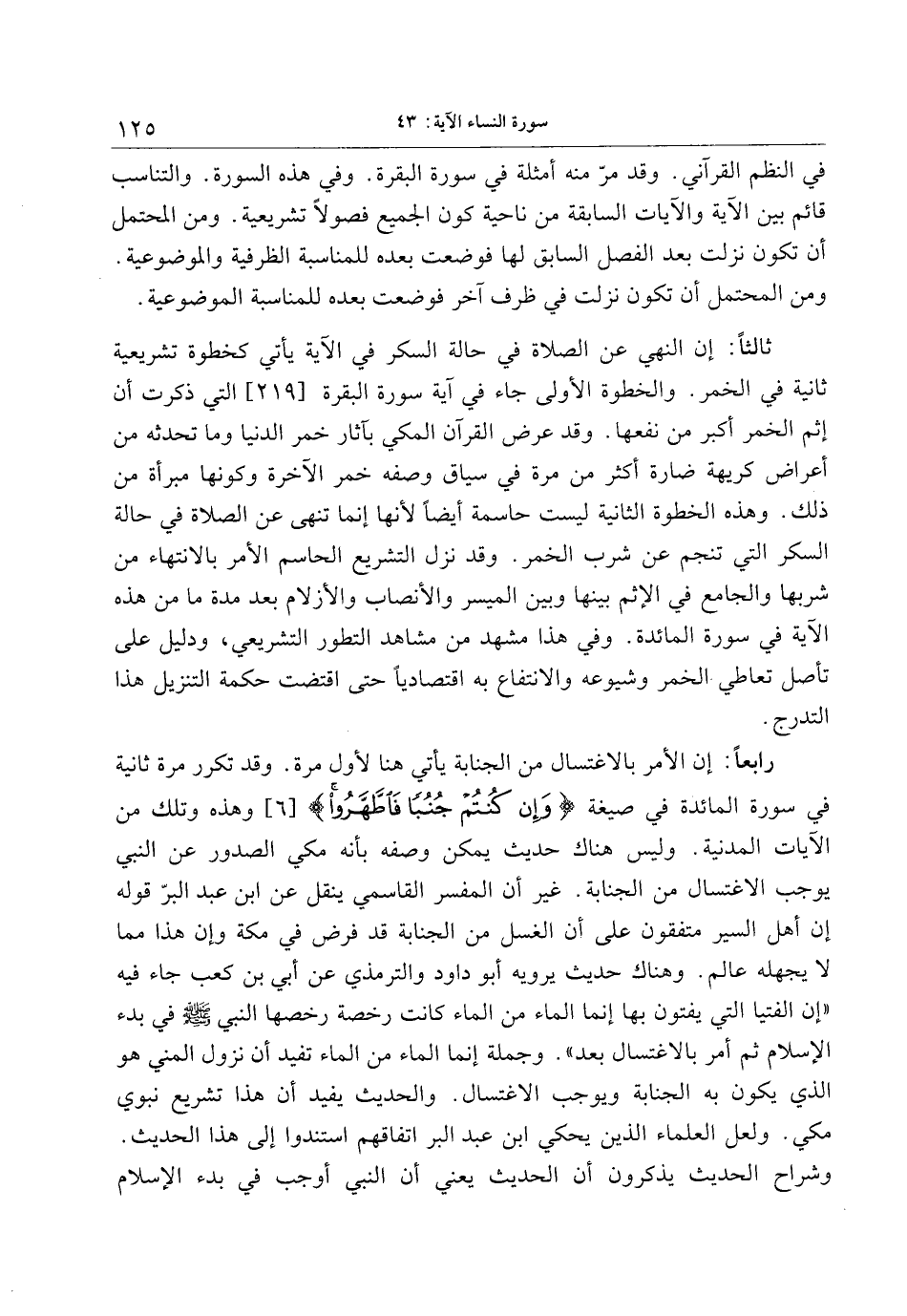ثالثا: إن النهي عن الصلاة في حالة السكر في الآية يأتي كخطوة تشريعية ثانية في الخمر. والخطوة الأولى جاء في آية سورة البقرة [219] التي ذكرت أن إثم الخمر أكبر من نفعها. وقد عرض القرآن المكي بآثار خمر الدنيا وما تحدثه من أعراض كريهة ضارة أكثر من مرة في سياق وصفه خمر الآخرة وكونها مبرأة من ذلك. وهذه الخطوة الثانية ليست حاسمة أيضا لأنها إنما تنهى عن الصلاة في حالة السكر التي تنجم عن شرب الخمر. وقد نزل التشريع الحاسم الأمر بالانتهاء من شربها والجامع في الإثم بينها وبين الميسر والأنصاب والأزلام بعد مدة ما من هذه الآية في سورة المائدة. وفي هذا مشهد من مشاهد التطور التشريعي، ودليل على تأصل تعاطي الخمر وشيوعه والانتفاع به اقتصاديا حتى اقتضت حكمة التنزيل هذا التدرج.