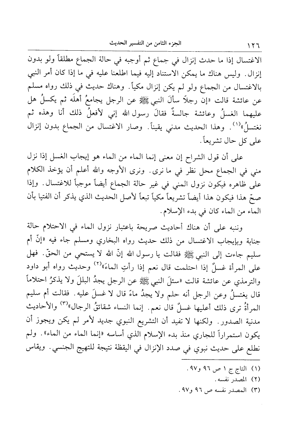 على أن قول الشراح إن معنى إنما الماء من الماء هو إيجاب الغسل إذا نزل مني في الجماع محل نظر في ما نرى. ونرى الأوجه والله أعلم أن يؤخذ الكلام على ظاهره فيكون نزول المني في غير حالة الجماع أيضا موجبا للاغتسال. وإذا صحّ هذا فيكون هذا أيضا تشريعا مكيا تبعا لأصل الحديث الذي يذكر أن الفتيا بأن الماء من الماء كان في بدء الإسلام.