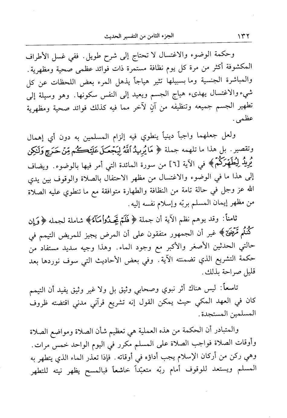 ثامنا: وقد يوهم نظم الآية أن جملة فَلَمْ تَجِدُوا ماءً شاملة لجمله وَإِنْ كُنْتُمْ مَرْضى غير أن الجمهور متفقون على أن المرض يجيز للمريض التيمم في حالتي الحدثين الأصغر والأكبر مع وجود الماء. وهذا وجيه سديد مستفاد من حكمة التشريع الذي تضمنته الآية. وفي بعض الأحاديث التي سوف نوردها بعد قليل صراحة بذلك.