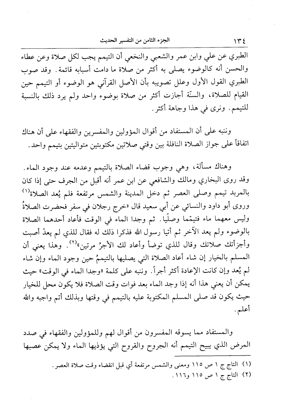 وقد روى البخاري ومالك والشافعي عن ابن عمر أنه أقبل من الجرف حتى إذا كان بالمربد تيمم وصلى العصر ثم دخل المدينة والشمس مرتفعة فلم يعد الصلاة «1» وروى أبو داود والنسائي عن أبي سعيد قال «خرج رجلان في سفر فحضرت الصلاة وليس معهما ماء فتيمّما وصلّيا. ثم وجدا الماء في الوقت فأعاد أحدهما الصلاة بالوضوء ولم يعد الآخر ثم أتيا رسول الله فذكرا ذلك له فقال للذي لم يعد أصبت وأجزأتك صلاتك وقال للذي توضأ وأعاد لك الأجر مرتين» «2» . وهذا يعني أن المسلم بالخيار إن شاء أعاد الصلاة التي يصليها بالتيمم حين وجود الماء وإن شاء لم يعد وإن كانت الإعادة أكثر أجرا. وننبه على كلمة «وجدا الماء في الوقت» حيث يمكن أن يعني هذا أنه إذا وجد الماء بعد فوات وقت الصلاة فلا يكون محل للخيار حيث يكون قد صلى المسلم المكتوبة عليه بالتيمم في وقتها وبذلك أتم واجبه والله أعلم.