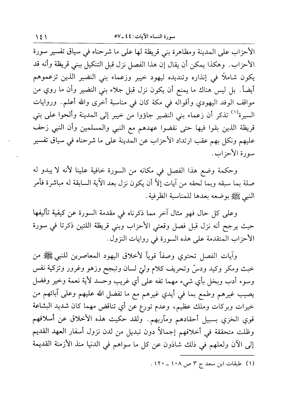 الأحزاب على المدينة ومظاهرة بني قريظة لها على ما شرحناه في سياق تفسير سورة الأحزاب. وهكذا يمكن أن يقال إن هذا الفصل نزل قبل التنكيل ببني قريظة وأنه قد يكون شاملا في إنذاره وتنديده ليهود خيبر وزعماء بني النضير الذين تزعموهم أيضا. بل ليس هناك ما يمنع أن يكون نزل قبل جلاء بني النضير وأن ما روي من مواقف الوفد اليهودي وأقواله في مكة كان في مناسبة أخرى والله أعلم. وروايات السيرة «1» تذكر أن زعماء بني النضير جاؤوا من خيبر إلى المدينة وألحوا على بني قريظة الذين بقوا فيها حتى نقضوا عهدهم مع النبي والمسلمين وأن النبي زحف عليهم ونكل بهم عقب ارتداد الأحزاب عن المدينة على ما شرحناه في سياق تفسير سورة الأحزاب.