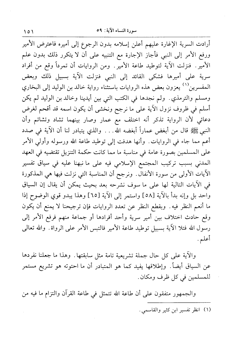 أرادت السرية الإغارة عليهم أعلن إسلامه بدون الرجوع إلى أميره فاعترض الأمير ورفع الأمر إلى النبي فأجاز الإجارة مع التنبيه على أن لا يتكرر ذلك بدون علم الأمير. فنزلت الآية لتوطيد طاعة الأمير. ومن الروايات أن تمردا وقع من أفراد سرية على أميرها فشكى القائد إلى النبي فنزلت الآية بسبيل ذلك وبعض المفسرين «1» يعزون بعض هذه الروايات باستثناء رواية خالد بن الوليد إلى البخاري ومسلم والترمذي. ولم نجدها في الكتب التي بين أيدينا وخالد بن الوليد لم يكن أسلم في ظروف نزول الآية على ما نرجح ونخشى أن يكون اسمه قد أقحم لغرض دعائي لأن الرواية تذكر أنه اختلف مع عمار وصار بينهما تشاد وتشاتم وأن النبي صلى الله عليه وسلم قال من أبغض عمارا أبغضه الله ... والذي يتبادر لنا أن الآية في صدد أعم مما جاء في الروايات. وأنها هدفت إلى توطيد طاعة الله ورسوله وأولي الأمر على المسلمين بصورة عامة في مناسبة ما مما كانت حكمة التنزيل تقتضيه في العهد المدني بسبب تركيب المجتمع الإسلامي فيه على ما نبهنا عليه في سياق تفسير الآيات الأولى من سورة الأنفال. ونرجح أن المناسبة التي نزلت فيها هي المذكورة في الآيات التالية لها على ما سوف نشرحه بعد بحيث يمكن أن يقال إن السياق واحد بل وإنه بدأ بالآية [58] واستمر إلى الآية [65] وهذا يبدو قوي الوضوح إذا ما أنعم النظر فيه. وبقطع النظر عن تعدد الروايات فإن ترجيحنا لا يمنع أن يكون وقع حادث اختلاف بين أمير سرية وأحد أفرادها أو جماعة منهم فرفع الأمر إلى رسول الله فتلا الآية بسبيل توطيد طاعة الأمير فالتبس الأمر على الرواة. والله تعالى أعلم.