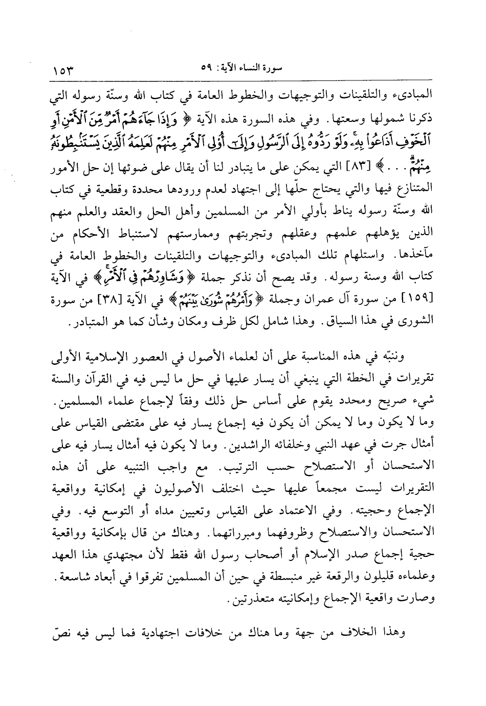 المبادئ والتلقينات والتوجيهات والخطوط العامة في كتاب الله وسنّة رسوله التي ذكرنا شمولها وسعتها. وفي هذه السورة هذه الآية وَإِذا جاءَهُمْ أَمْرٌ مِنَ الْأَمْنِ أَوِ الْخَوْفِ أَذاعُوا بِهِ وَلَوْ رَدُّوهُ إِلَى الرَّسُولِ وَإِلى أُولِي الْأَمْرِ مِنْهُمْ لَعَلِمَهُ الَّذِينَ يَسْتَنْبِطُونَهُ مِنْهُمْ ... [83] التي يمكن على ما يتبادر لنا أن يقال على ضوئها إن حل الأمور المتنازع فيها والتي يحتاج حلّها إلى اجتهاد لعدم ورودها محددة وقطعية في كتاب الله وسنّة رسوله يناط بأولي الأمر من المسلمين وأهل الحل والعقد والعلم منهم الذين يؤهلهم علمهم وعقلهم وتجربتهم وممارستهم لاستنباط الأحكام من مآخذها. واستلهام تلك المبادئ والتوجيهات والتلقينات والخطوط العامة في كتاب الله وسنة رسوله. وقد يصح أن نذكر جملة وَشاوِرْهُمْ فِي الْأَمْرِ في الآية [159] من سورة آل عمران وجملة وَأَمْرُهُمْ شُورى بَيْنَهُمْ في الآية [38] من سورة الشورى في هذا السياق. وهذا شامل لكل ظرف ومكان وشأن كما هو المتبادر.