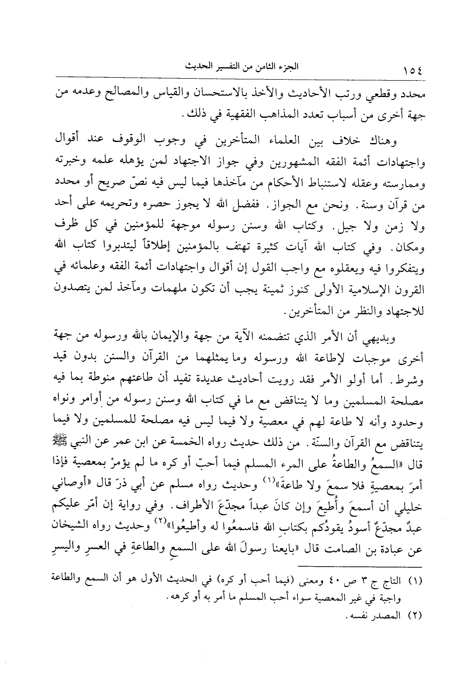 وبديهي أن الأمر الذي تتضمنه الآية من جهة والإيمان بالله ورسوله من جهة أخرى موجبات لإطاعة الله ورسوله وما يمثلهما من القرآن والسنن بدون قيد وشرط. أما أولو الأمر فقد رويت أحاديث عديدة تفيد أن طاعتهم منوطة بما فيه مصلحة المسلمين وما لا يتناقض مع ما في كتاب الله وسنن رسوله من أوامر ونواه وحدود وأنه لا طاعة لهم في معصية ولا فيما ليس فيه مصلحة للمسلمين ولا فيما يتناقض مع القرآن والسنّة. من ذلك حديث رواه الخمسة عن ابن عمر عن النبي صلى الله عليه وسلم قال «السمع والطاعة على المرء المسلم فيما أحبّ أو كره ما لم يؤمر بمعصية فإذا أمر بمعصية فلا سمع ولا طاعة» «1» وحديث رواه مسلم عن أبي ذرّ قال «أوصاني خليلي أن أسمع وأطيع وإن كان عبدا مجدّع الأطراف. وفي رواية إن أمّر عليكم عبد مجدّع أسود يقودكم بكتاب الله فاسمعوا له وأطيعوا» «2» وحديث رواه الشيخان عن عبادة بن الصامت قال «بايعنا رسول الله على السمع والطاعة في العسر واليسر