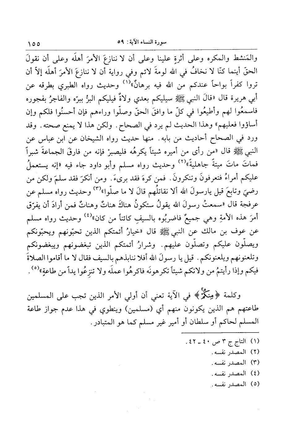 والمنشط والمكره وعلى أثرة علينا وعلى أن لا ننازع الأمر أهله وعلى أن نقول الحقّ أينما كنّا لا نخاف في الله لومة لائم وفي رواية أن لا ننازع الأمر أهله إلّا أن تروا كفرا بواحا عندكم من الله فيه برهان» «1» وحديث رواه الطبري بطرقه عن أبي هريرة قال «قال النبي صلى الله عليه وسلم سيليكم بعدي ولاة فيليكم البرّ ببرّه والفاجر بفجوره فاسمعوا لهم وأطيعوا في كلّ ما وافق الحقّ وصلّوا وراءهم فإن أحسنوا فلكم وإن أساؤوا فعليهم» وهذا الحديث لم يرد في الصحاح. ولكن هذا لا يمنع صحته. وقد ورد في الصحاح أحاديث من بابه. منها حديث رواه الشيخان عن ابن عباس عن النبي صلى الله عليه وسلم قال «من رأى من أميره شيئا يكرهه فليصبر فإنه من فارق الجماعة شبرا فمات مات ميتة جاهلية» «2» وحديث رواه مسلم وأبو داود جاء فيه «إنه يستعمل عليكم أمراء فتعرفون وتنكرون. فمن كره فقد برىء. ومن أنكر فقد سلم ولكن من رضي وتابع قيل يا رسول الله ألا نقاتلهم قال لا ما صلّوا» «3» وحديث رواه مسلم عن عرفجة قال «سمعت رسول الله يقول ستكون هناك هنات وهنات فمن أراد أن يفرّق أمر هذه الأمة وهي جميع فاضربوه بالسيف كائنا من كان» «4» وحديث رواه مسلم عن عوف بن مالك عن النبي صلى الله عليه وسلم قال «خيار أئمتكم الذين تحبّونهم ويحبّونكم ويصلّون عليكم وتصلّون عليهم. وشرار أئمتكم الذين تبغضونهم ويبغضونكم وتلعنونهم ويلعنونكم. قيل يا رسول الله أفلا ننابذهم بالسيف فقال لا ما أقاموا الصلاة فيكم وإذا رأيتم من ولاتكم شيئا تكرهونه فاكرهوا عمله ولا تنزعوا يدا من طاعة» » .