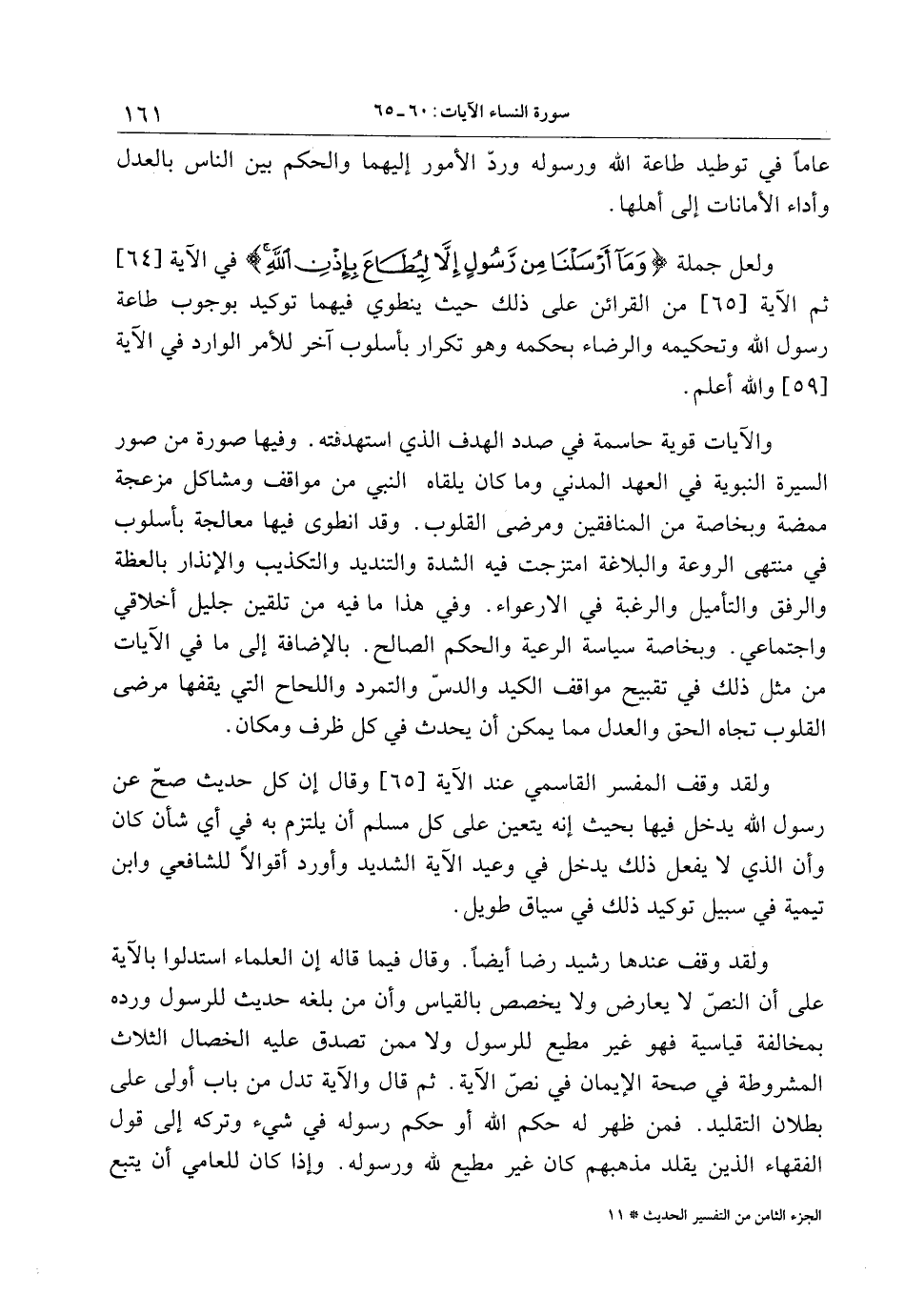 ولقد وقف عندها رشيد رضا أيضا. وقال فيما قاله إن العلماء استدلوا بالآية على أن النصّ لا يعارض ولا يخصص بالقياس وأن من بلغه حديث للرسول ورده بمخالفة قياسية فهو غير مطيع للرسول ولا ممن تصدق عليه الخصال الثلاث المشروطة في صحة الإيمان في نصّ الآية. ثم قال والآية تدل من باب أولى على بطلان التقليد. فمن ظهر له حكم الله أو حكم رسوله في شيء وتركه إلى قول الفقهاء الذين يقلد مذهبهم كان غير مطيع لله ورسوله. وإذا كان للعامي أن يتبع الجزء الثامن من التفسير الحديث 11